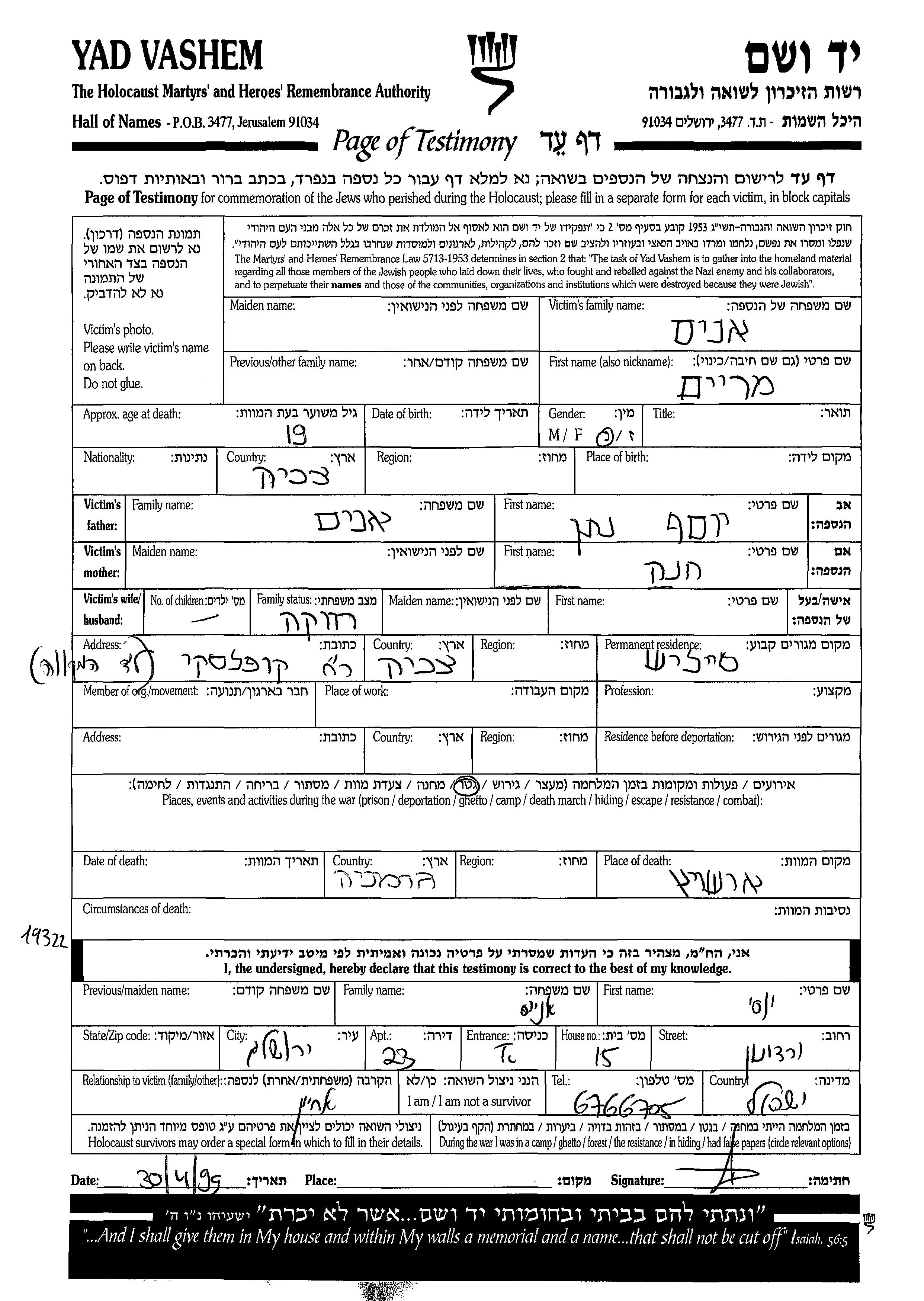 Miriam Anis, geb. Anis wurde in Tschechoslowakei geboren. Sie war die Tochter von Yosef Natan und Khana. Sie war Ledig. Vor dem Zweiten Weltkrieg lebte sie in Szollos, Tschechoslowakei.