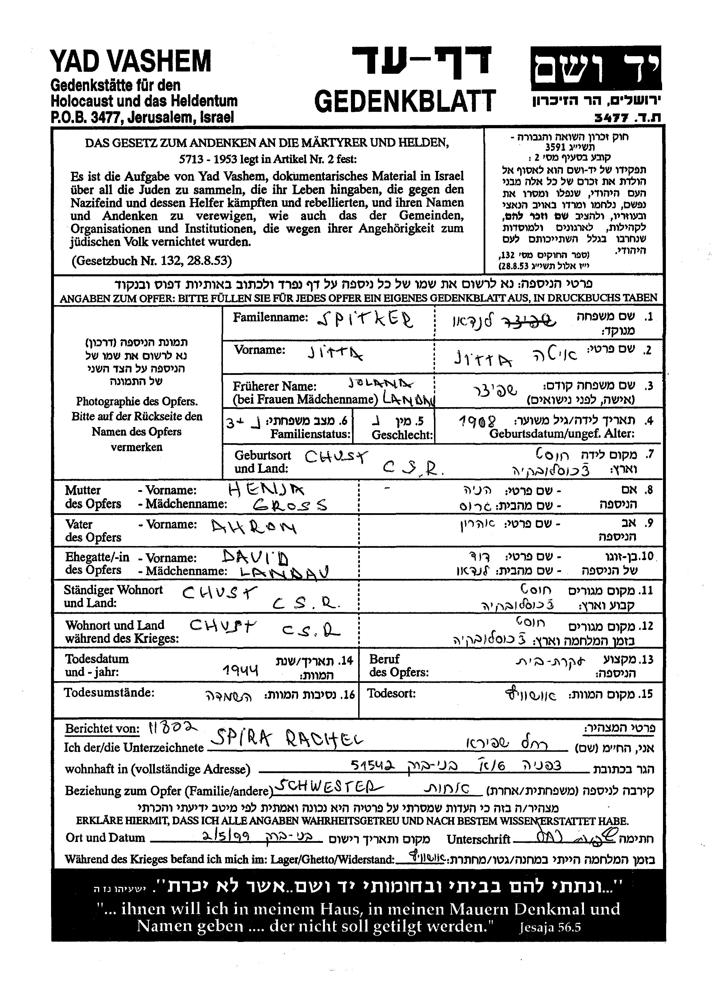 Jitta Landau, geb. Spitker Shpitzer wurde im Jahr 1908 in Chust, Tschechoslowakei geboren. Sie war die Tochter von Ahron und Henja. Sie war Hausfrau und mit David Verheiratet. Vor dem Zweiten Weltkrieg lebte sie in Chust, Tschechoslowakei. Während des Krieges war sie in Chust, Tschechoslowakei.