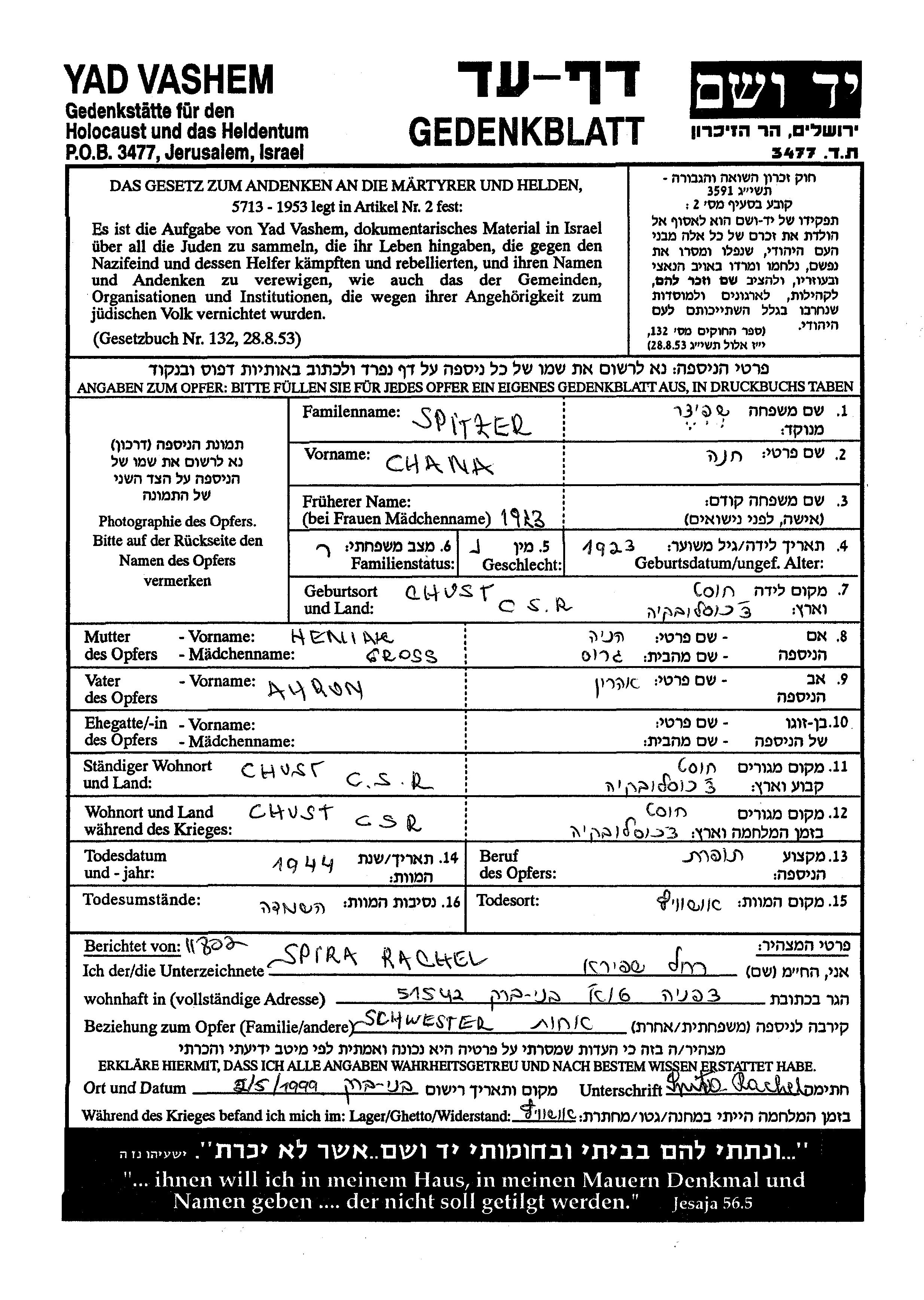 Chana Spitzer wurde im Jahr 1923 in Chust, Tschechoslowakei geboren. Sie war die Tochter von Ahron und Heniah Henia. Sie war Schneiderin und Ledig. Vor dem Zweiten Weltkrieg lebte sie in Chust, Tschechoslowakei. Während des Krieges war sie in Chust, Tschechoslowakei.