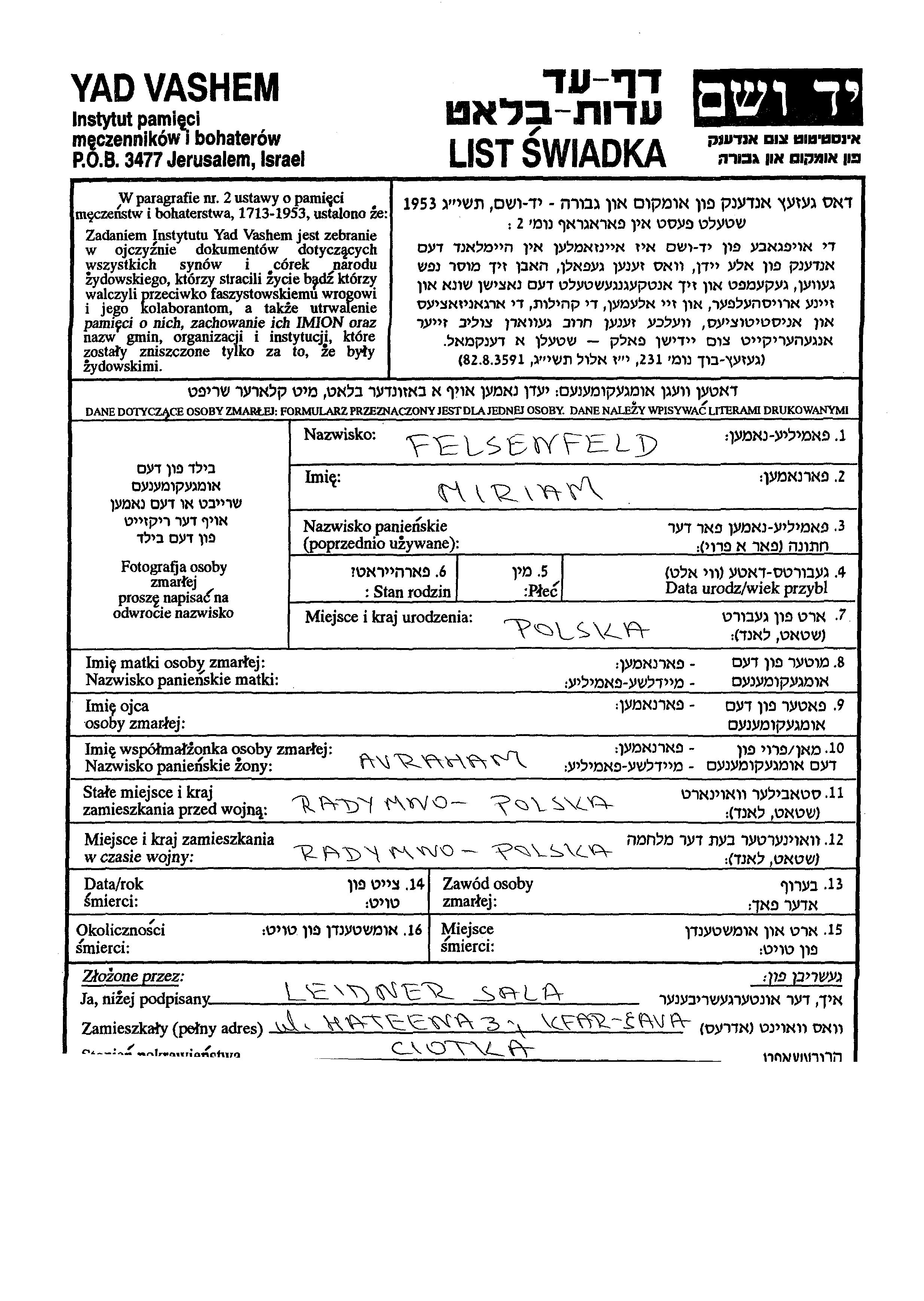 Miriam Felsenfeld wurde in Polen geboren. Vor dem Zweiten Weltkrieg lebte sie in Radymno, Polen. Während des Krieges war sie in Radymno, Polen.