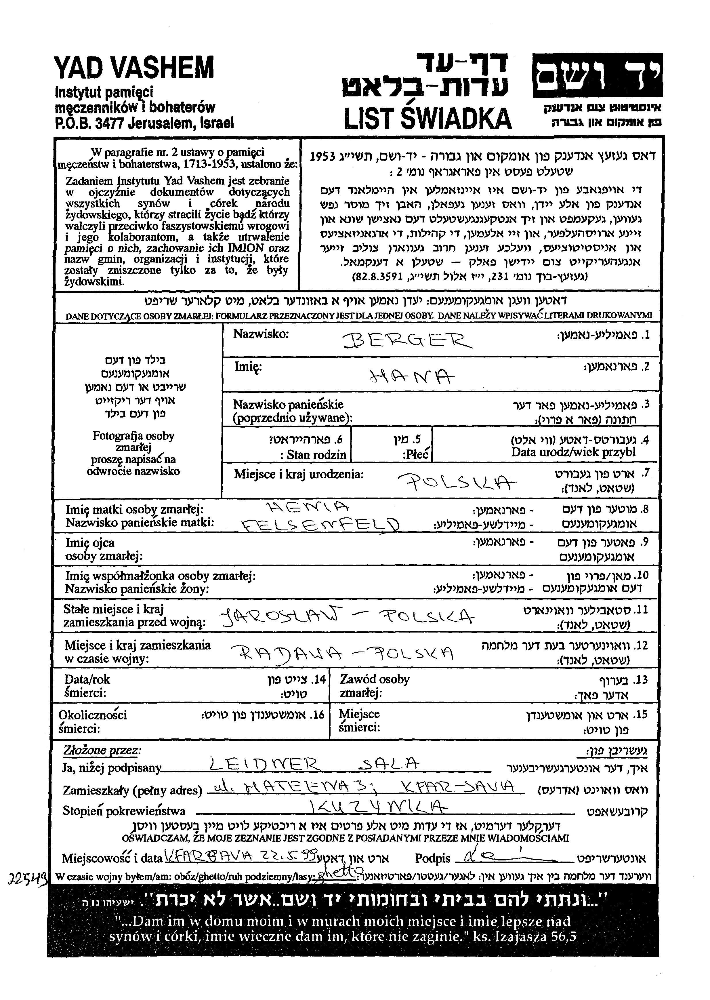 Berger Hana Yaroslav, Polen Gedenkblatt