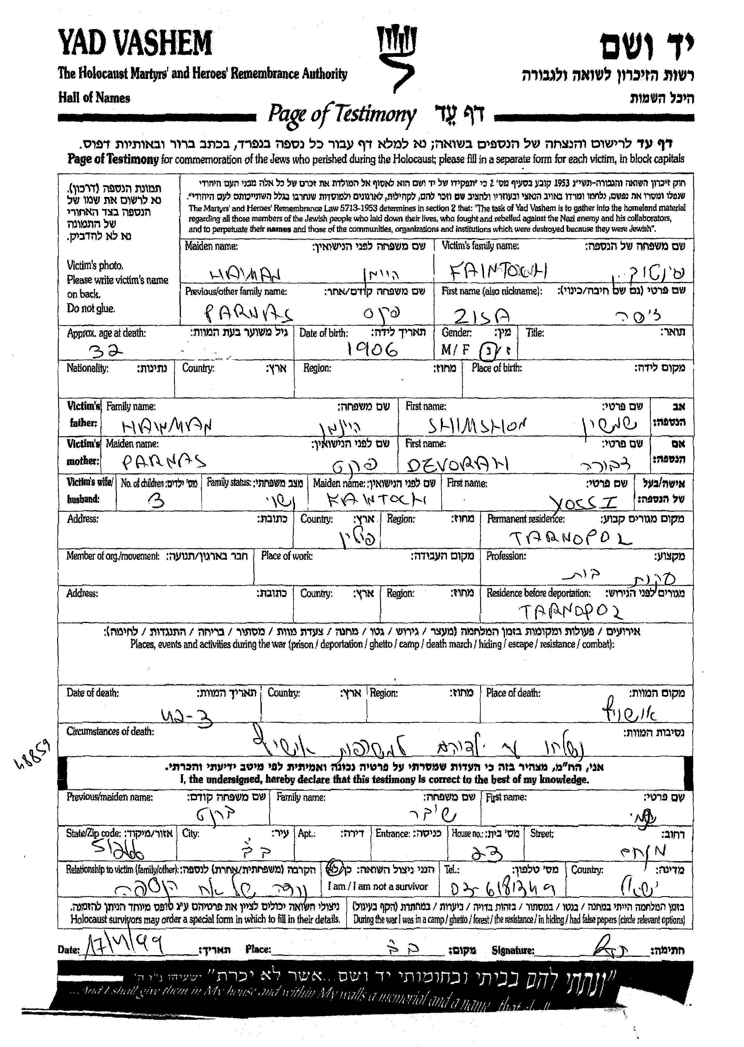 Zisa Faintoch, geb. Haiman wurde im Jahr 1906 geboren. Sie war die Tochter von Shimshon und Devorah. Sie war Hausfrau und mit Yossi Verheiratet. Vor dem Zweiten Weltkrieg lebte sie in Tarnopol, Polen. Während des Krieges war sie in Tarnopol, Polen.