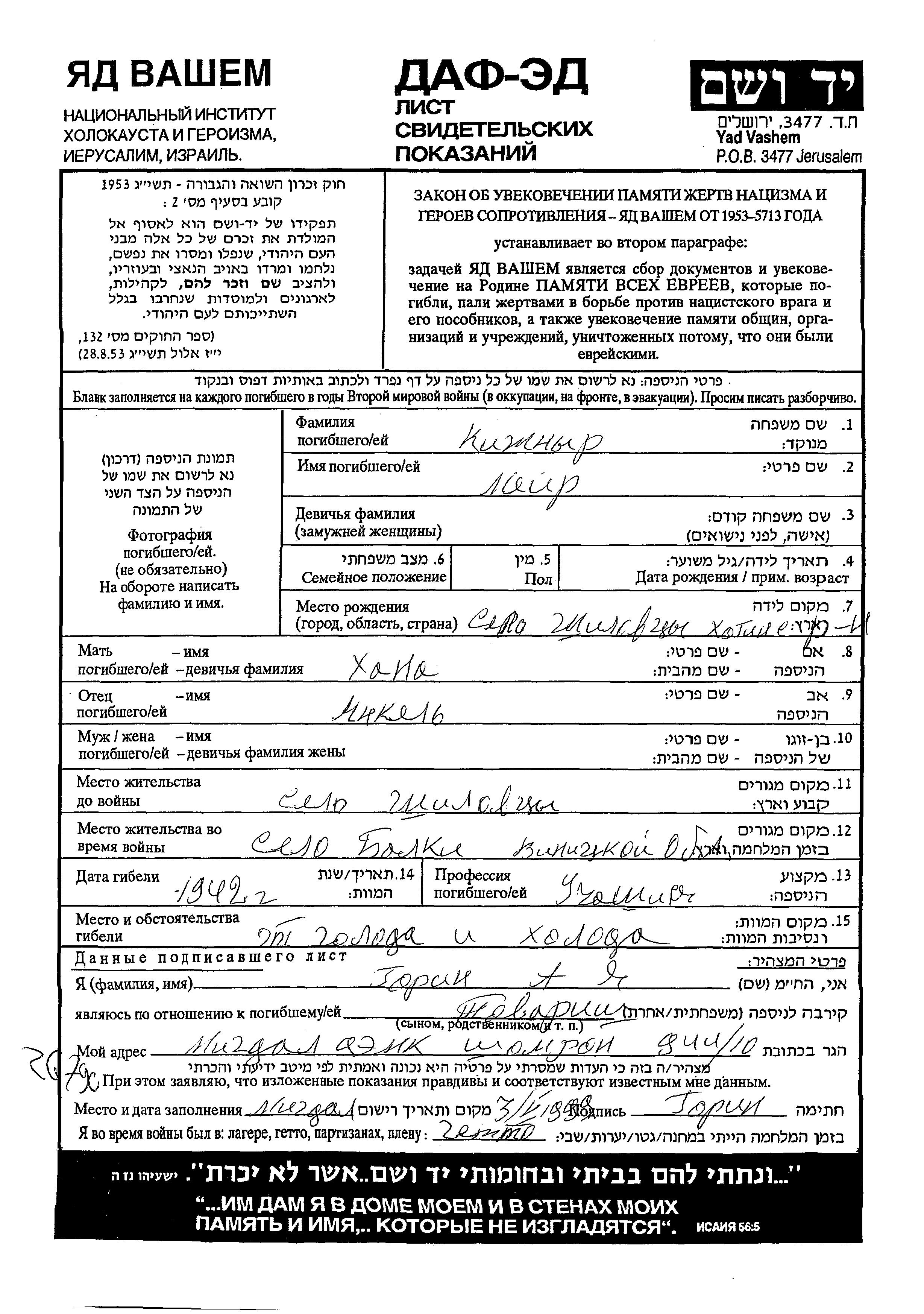 Meyer Kizhnyr wurde in Shilovtsy, Rumänien geboren. Er war der Sohn von Mikhael und Khana. Er war Schüler/-in. Vor dem Zweiten Weltkrieg lebte er in Shilovtsy, Rumänien. Während des Krieges war er in Balki, Ukraine (UdSSR).