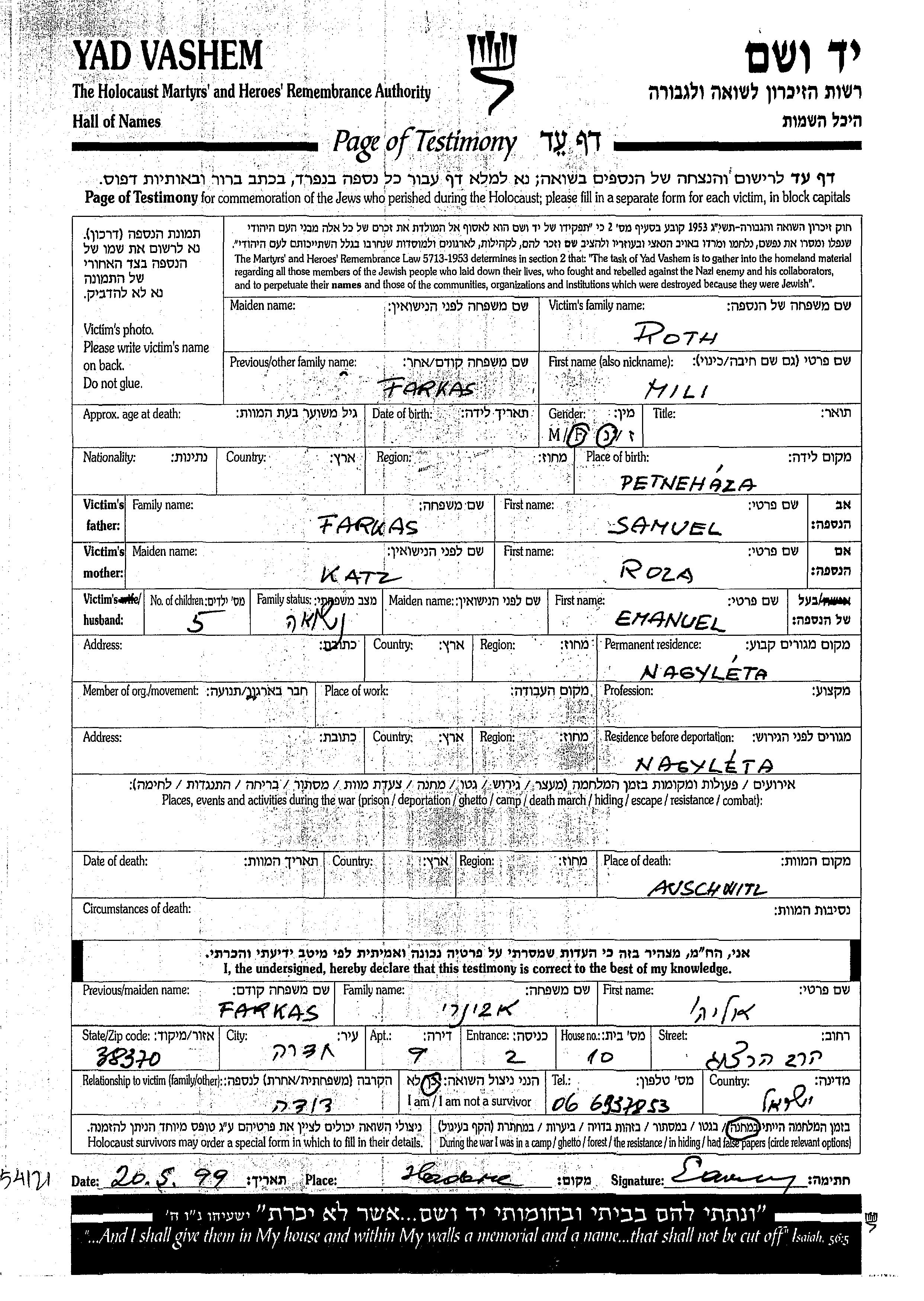 Mili Roth, geb. Farkas wurde in Petnehaza, Ungarn geboren. Sie war die Tochter von Samuel und Roza. Sie war mit Emanuel Verheiratet. Vor dem Zweiten Weltkrieg lebte sie in Nagyleta, Ungarn. Während des Krieges war sie in Nagyleta, Ungarn.