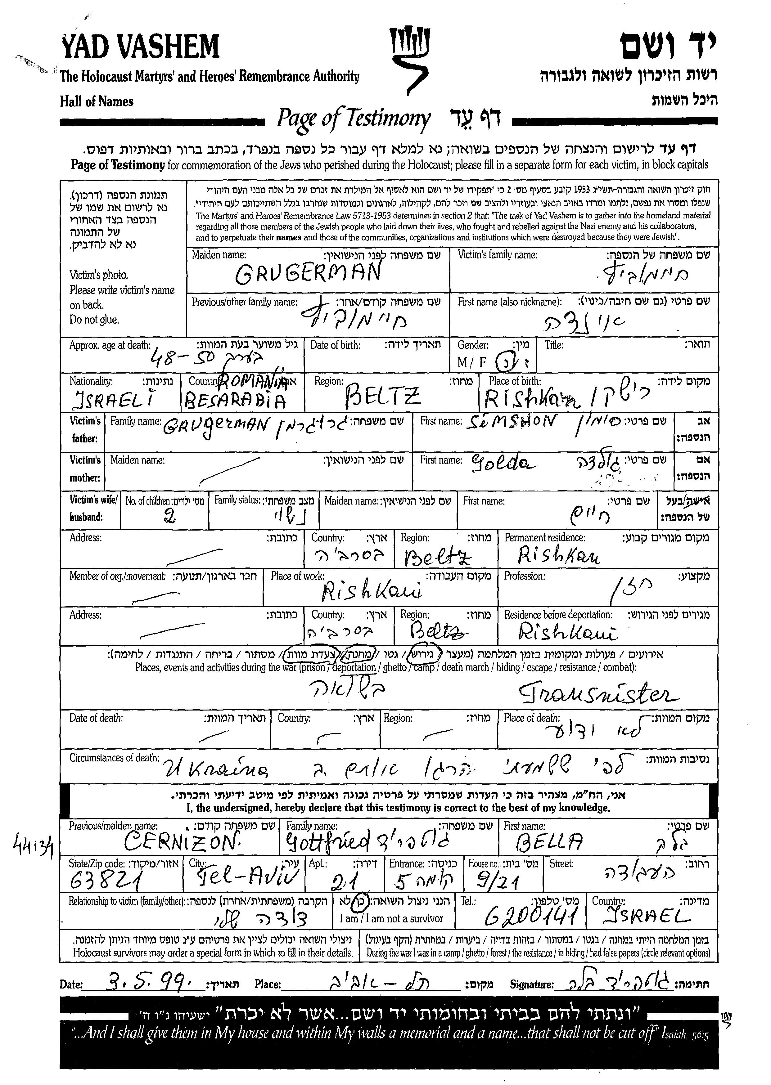 Hinda Khaimovich, geb. Grugerman wurde in Rishkan, Rumänien geboren. Sie war die Tochter von Semshon Simon und Golda. Sie war Ehefrau eines kantoren und mit Khaim Verheiratet. Vor dem Zweiten Weltkrieg lebte sie in Rishkan, Rumänien. Während des Krieges war sie in Rishkan, Rumänien.