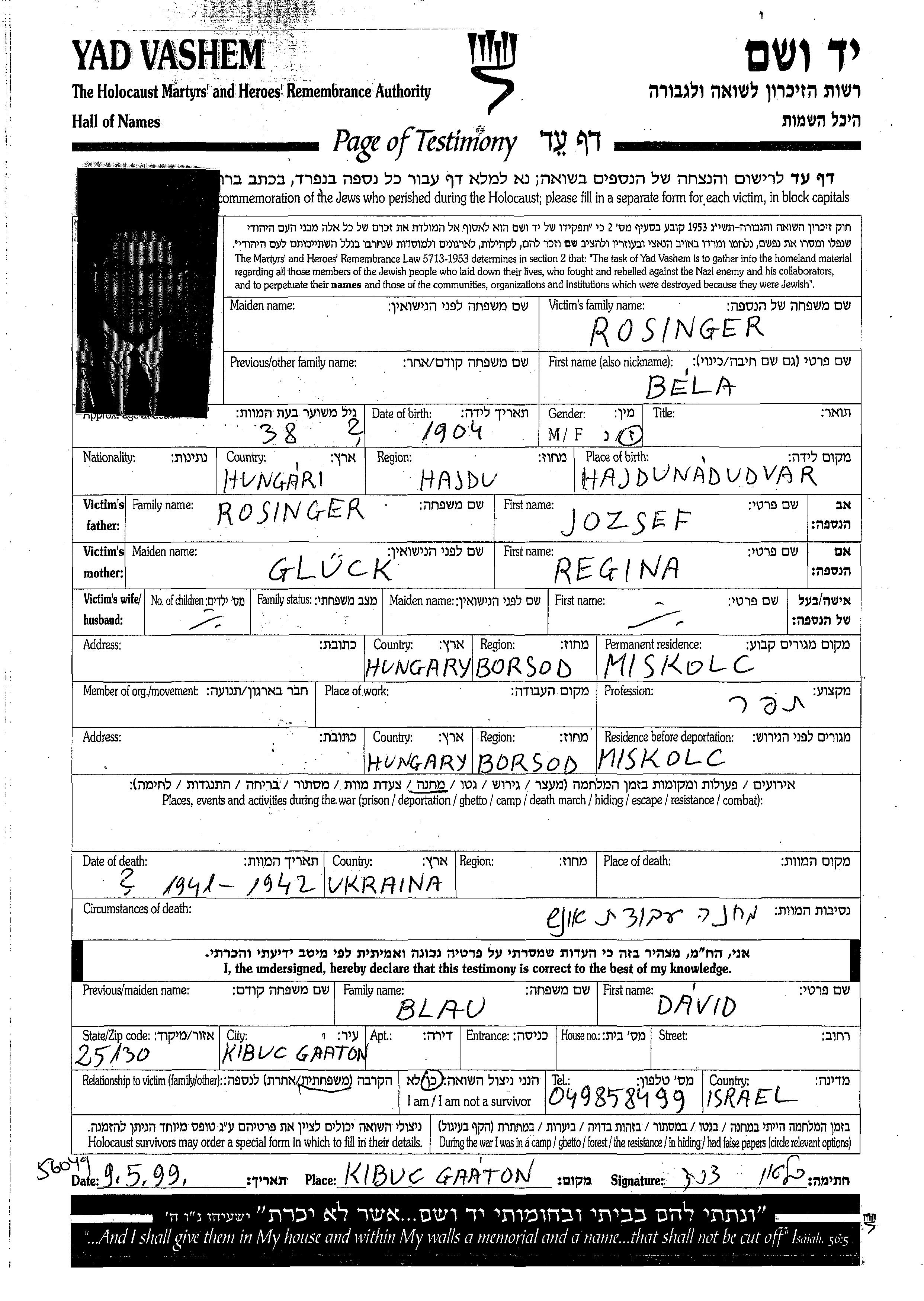 Bela Rosinger wurde im Jahr 1904 in Hajdunadudvar, Ungarn geboren. Er war der Sohn von Jozsef und Regina, geb. Gluck. Er war Näher. Vor dem Zweiten Weltkrieg lebte er in Miskolc, Ungarn. Während des Krieges war er in Miskolc, Ungarn.
