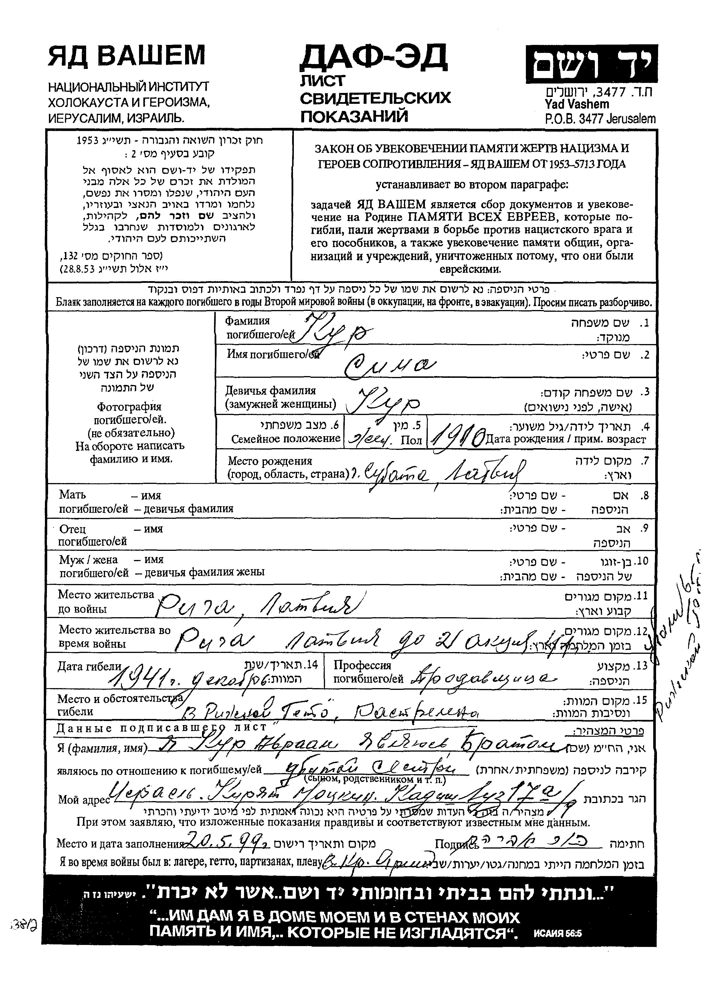 Sima wurde in der Schoah ermordet. Todesort: Riga, Lettland im Jahr 12/1941.