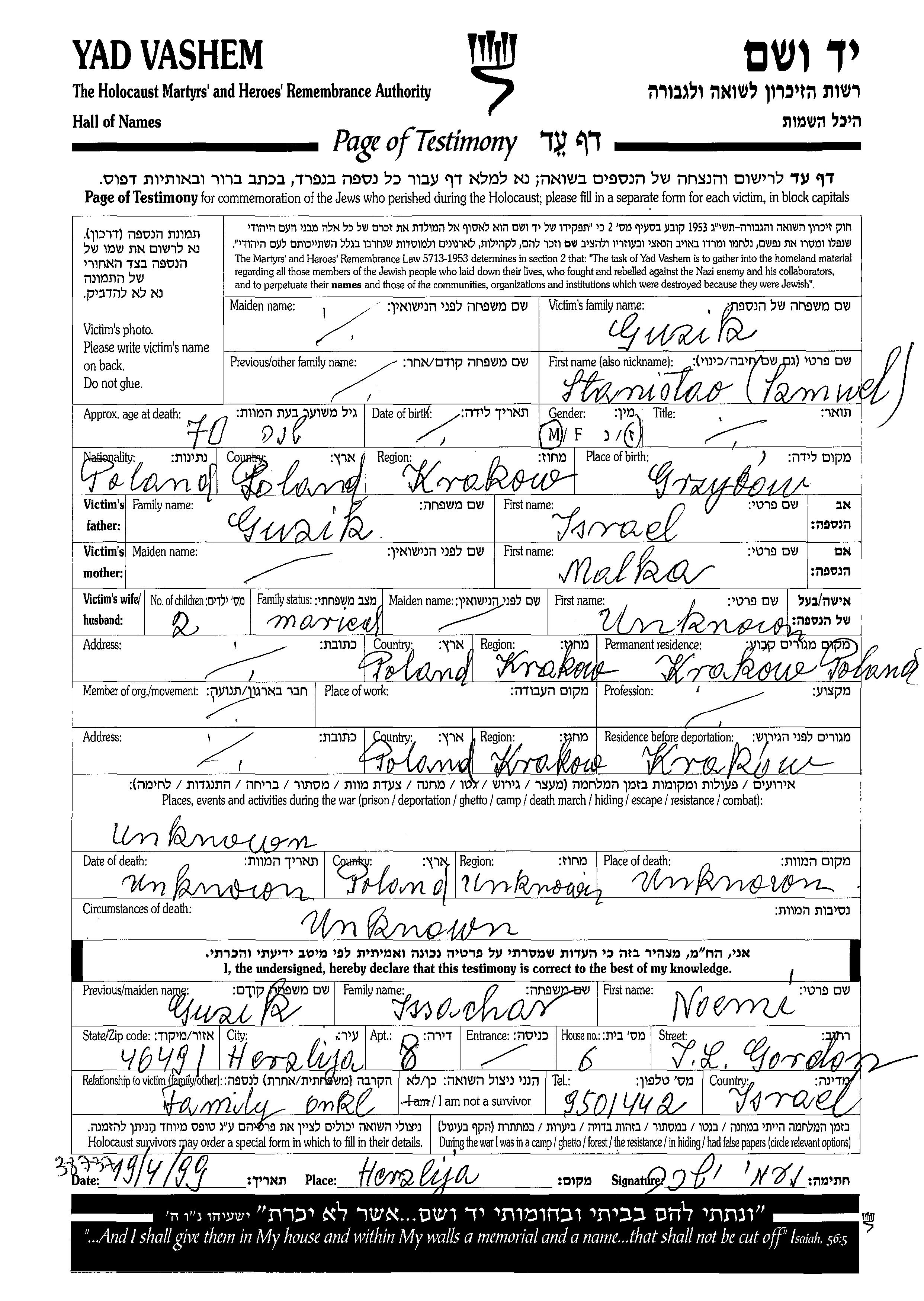 Stanislao Szmuel Gizik wurde in Grzybow, Polen geboren. Er war der Sohn von Israel und Malka. Er war Verheiratet. Vor dem Zweiten Weltkrieg lebte er in Krakow, Polen. Während des Krieges war er in Krakow, Polen.