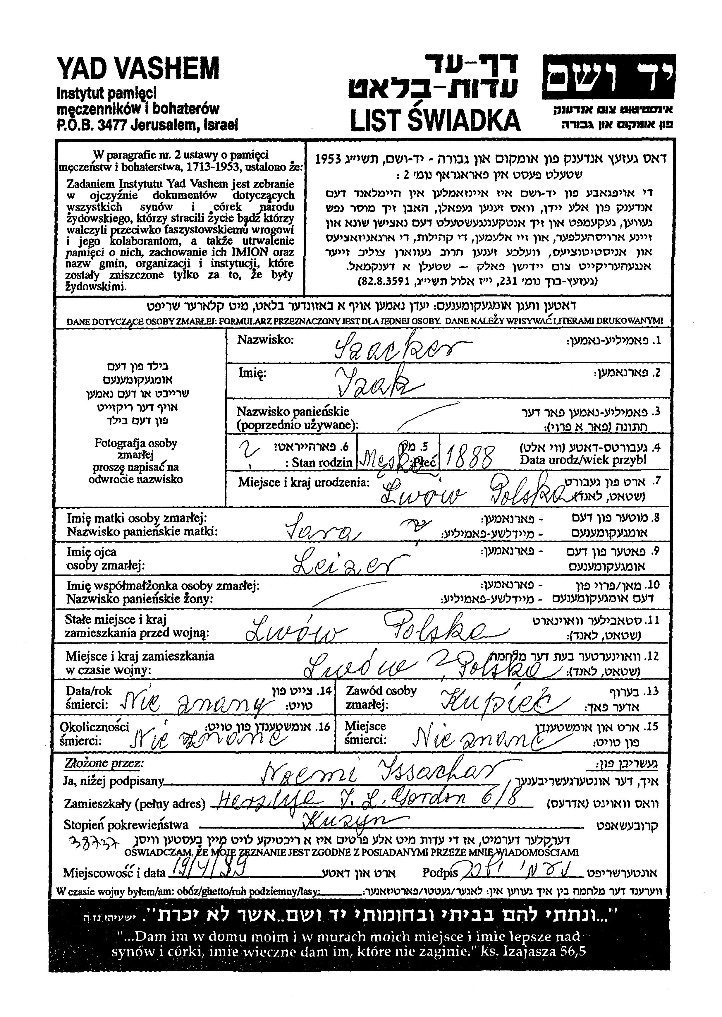 Izak Szacker wurde im Jahr 1888 in Lwow, Polen geboren. Er war der Sohn von Leizer und Sara. Er war Kaufmann/-frau. Vor dem Zweiten Weltkrieg lebte er in Lwow, Polen. Während des Krieges war er in Lwow, Polen.
