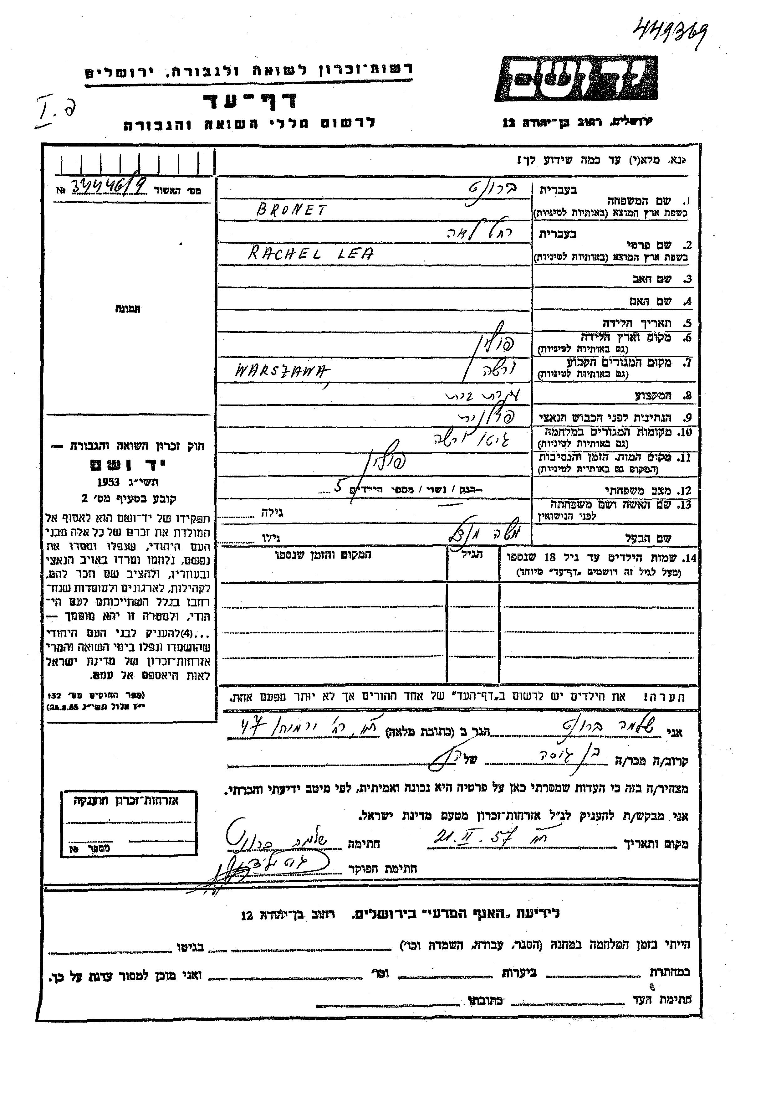 Bronet Rachel Lea Warsaw, Polen Gedenkblatt