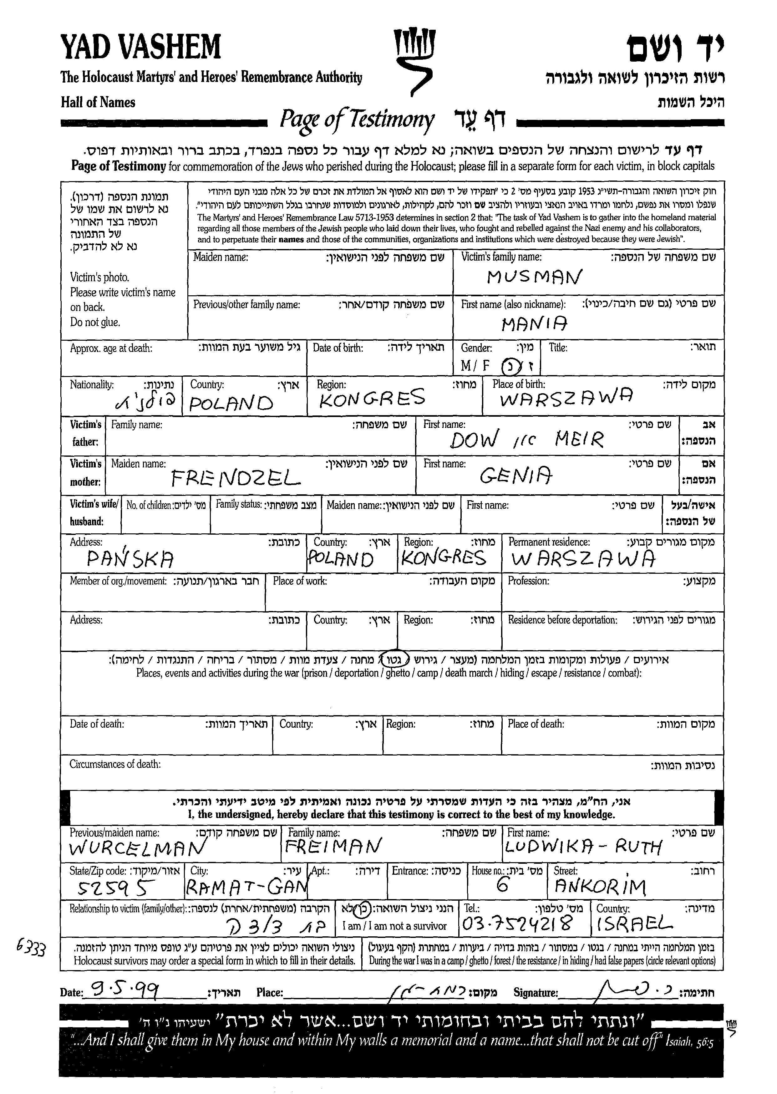 Mania Musman wurde in Warszawa, Polen geboren. Sie war die Tochter von Meir Dow und Genia. Vor dem Zweiten Weltkrieg lebte sie in Warszawa, Polen.