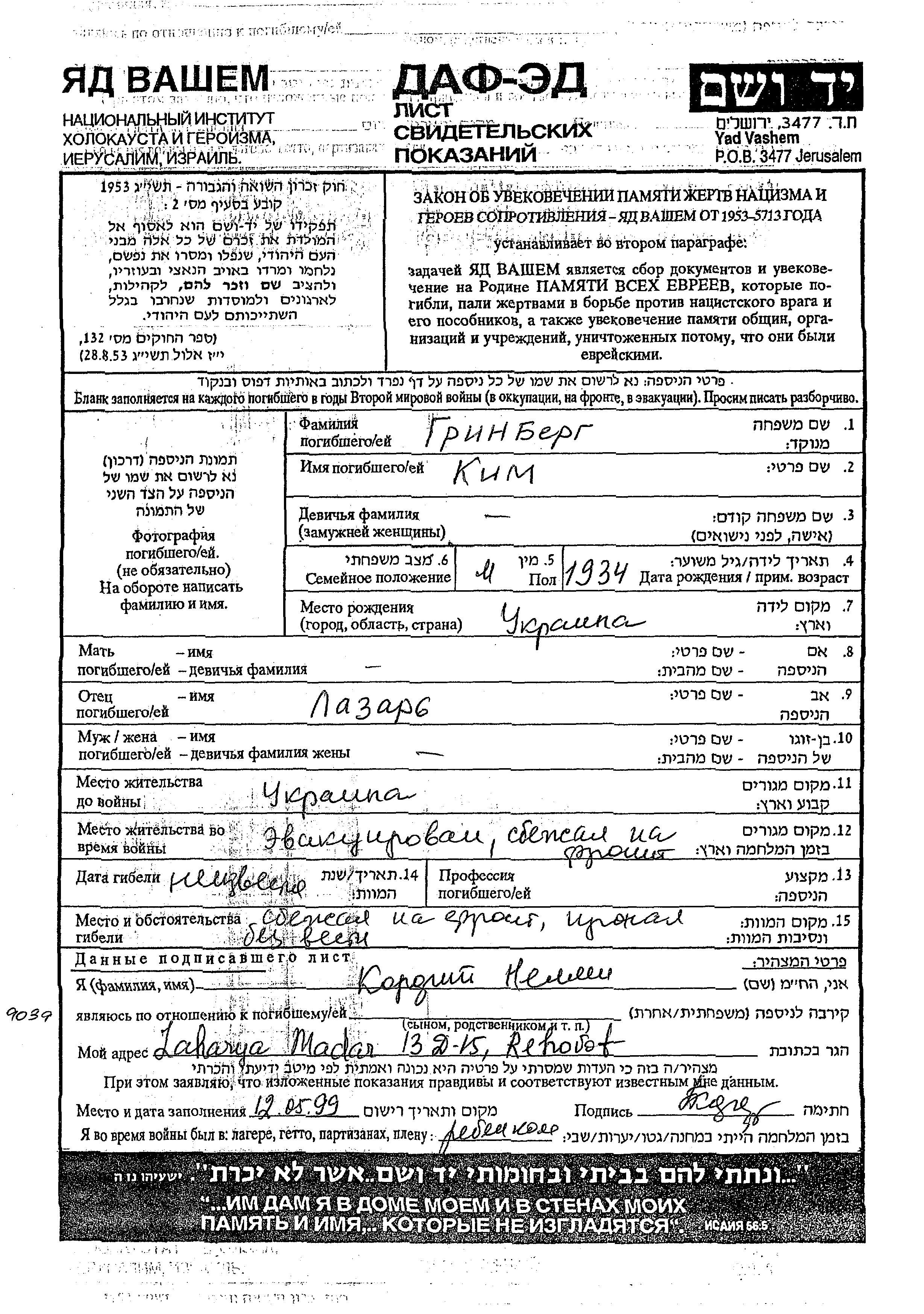 Kim Grinberg wurde im Jahr 1934 in Ukraine (UdSSR) geboren. Er war der Sohn von Lazar. Vor dem Zweiten Weltkrieg lebte er in Ukraine (UdSSR).