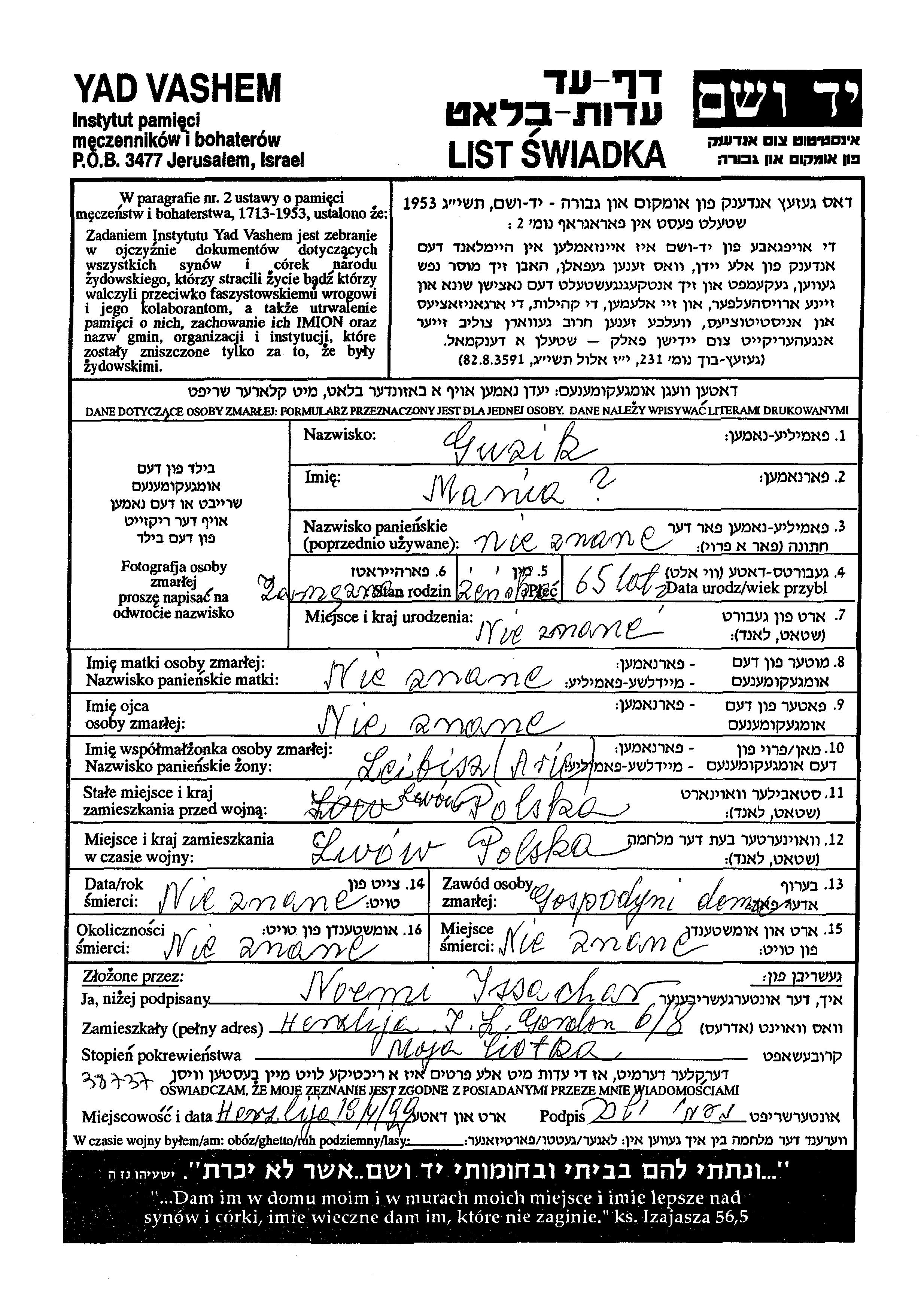 Mania Guzik. Sie war Hausfrau und mit Leibisz Arie Verheiratet. Vor dem Zweiten Weltkrieg lebte sie in Lwow, Polen. Während des Krieges war sie in Lwow, Polen.