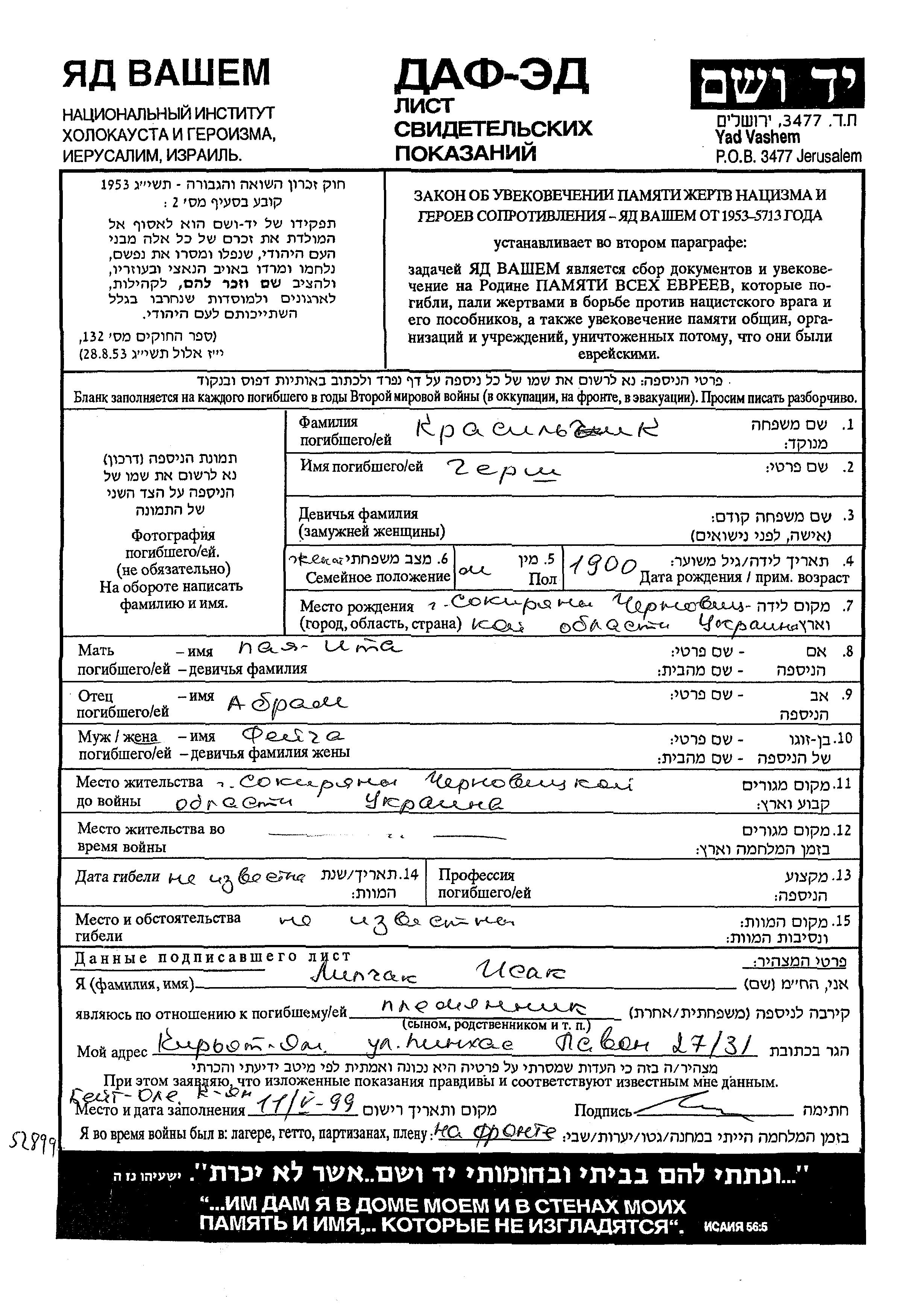 Gersh Krasilchik wurde im Jahr 1900 in Sokiryany, Rumänien geboren. Er war der Sohn von Abram und Paya Ita. Er war mit Feiga Verheiratet. Vor dem Zweiten Weltkrieg lebte er in Sokiryany, Rumänien. Während des Krieges war er in Sokiryany, Rumänien.