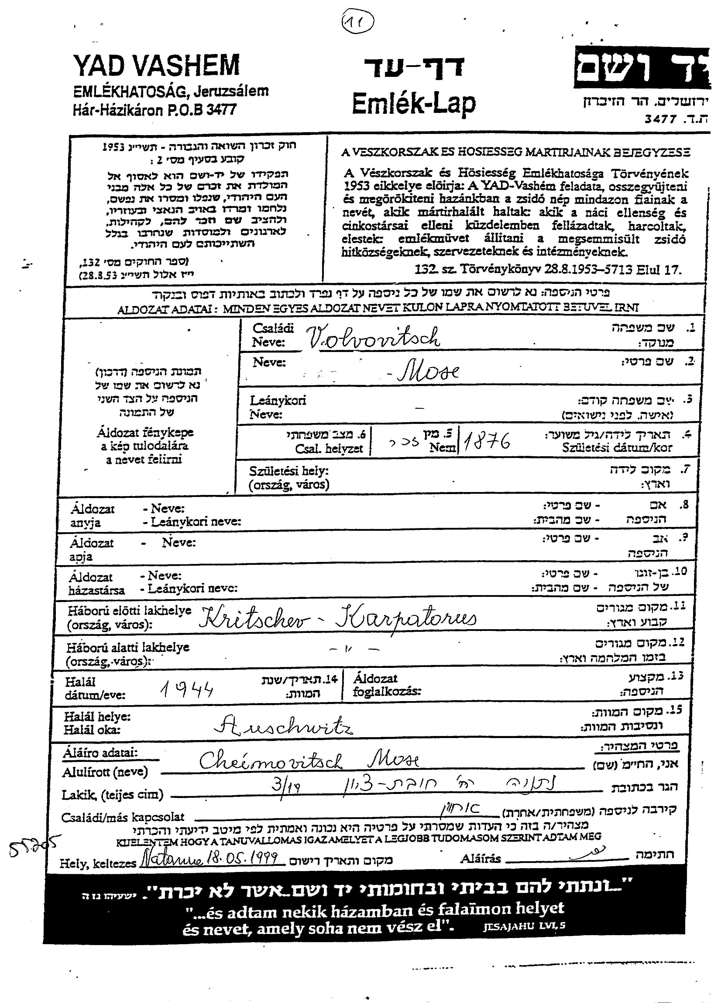 Mose wurde in der Schoah ermordet. Todesort: Auschwitz, Polen im Jahr 1944.
