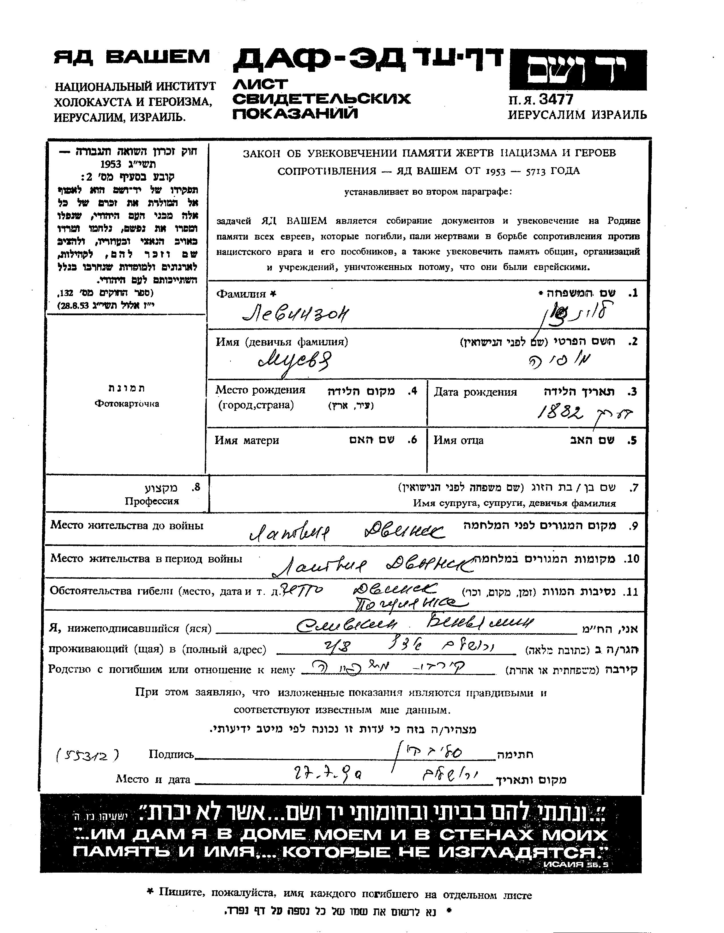 Musya Levinson wurde im Jahr 1882 geboren. Vor dem Zweiten Weltkrieg lebte sie in Dvinsk, Lettland. Während des Krieges war sie in Dvinsk, Lettland.