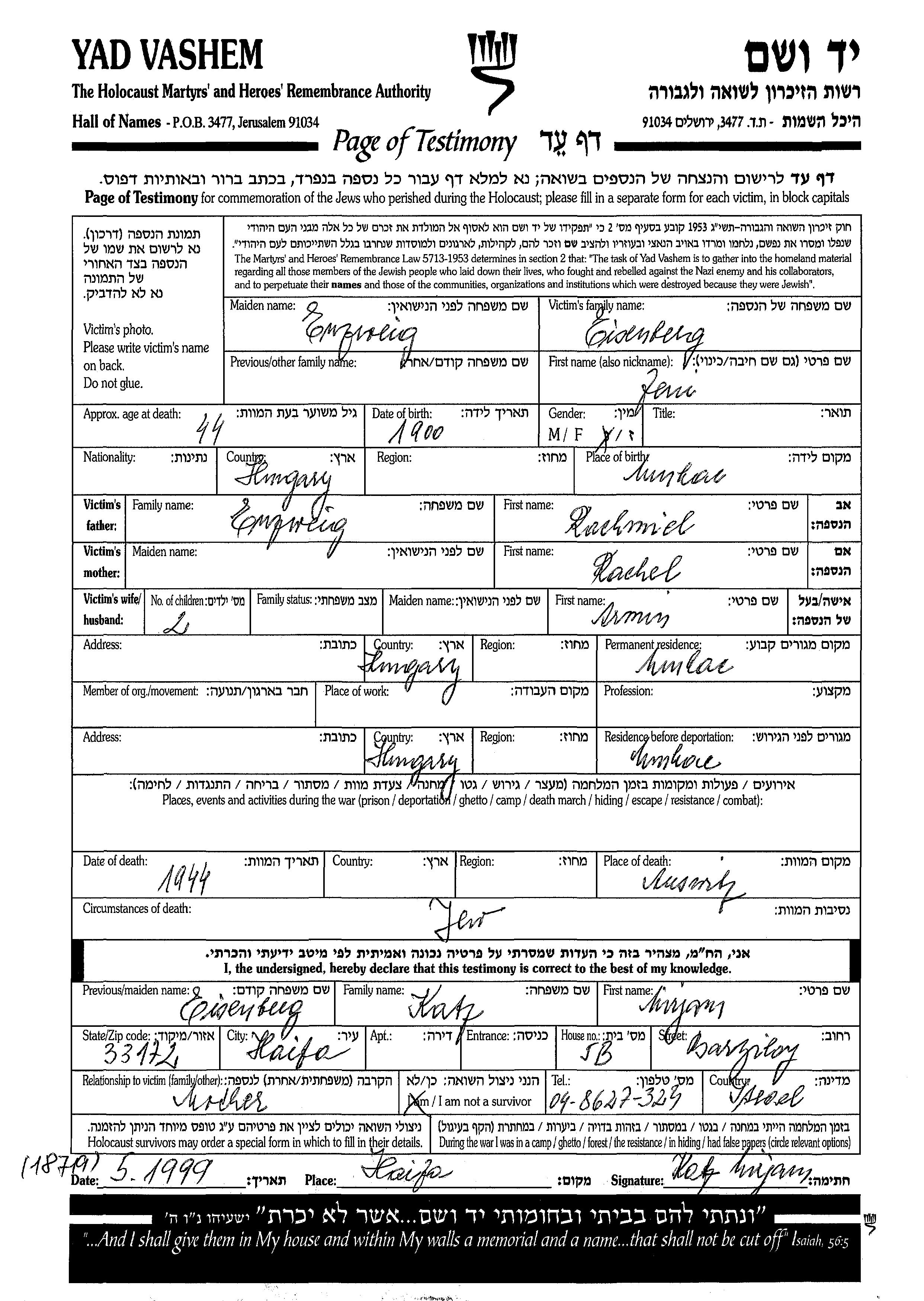 Jeni Eisenberg, geb. Enzweig wurde im Jahr 1900 in Munkac, Tschechoslowakei geboren. Sie war die Tochter von Rachmiel und Rachel. Sie war mit Armin Verheiratet. Vor dem Zweiten Weltkrieg lebte sie in Munkac, Tschechoslowakei. Während des Krieges war sie in Munkac, Tschechoslowakei.