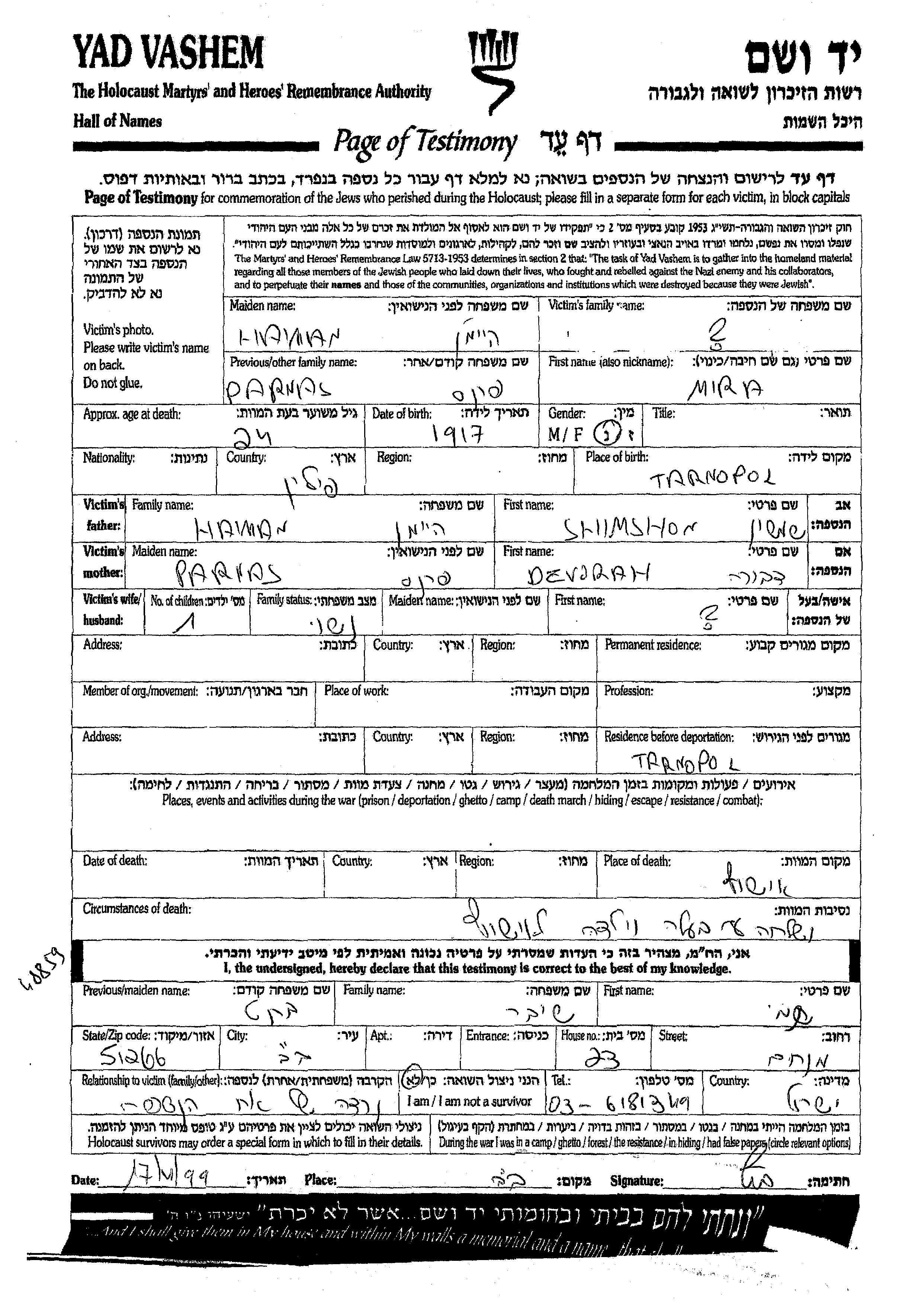 Mira Parnas, geb. Haiman wurde im Jahr 1917 in Tarnopol, Polen geboren. Sie war die Tochter von Shimshon und Devorah. Sie war Verheiratet. Während des Krieges war sie in Tarnopol, Polen.