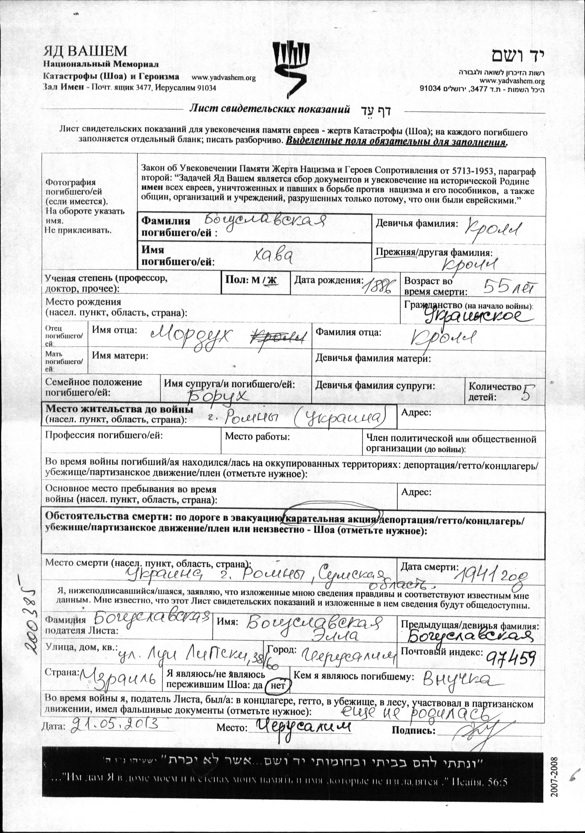 Khava Boguslavskaya, geb. Kroll wurde im Jahr 1886 geboren. Sie war die Tochter von Mordukh. Sie war mit Borukh Verheiratet. Vor dem Zweiten Weltkrieg lebte sie in Romny, Ukraine (UdSSR). Während des Krieges war sie in Romny, Ukraine (UdSSR).