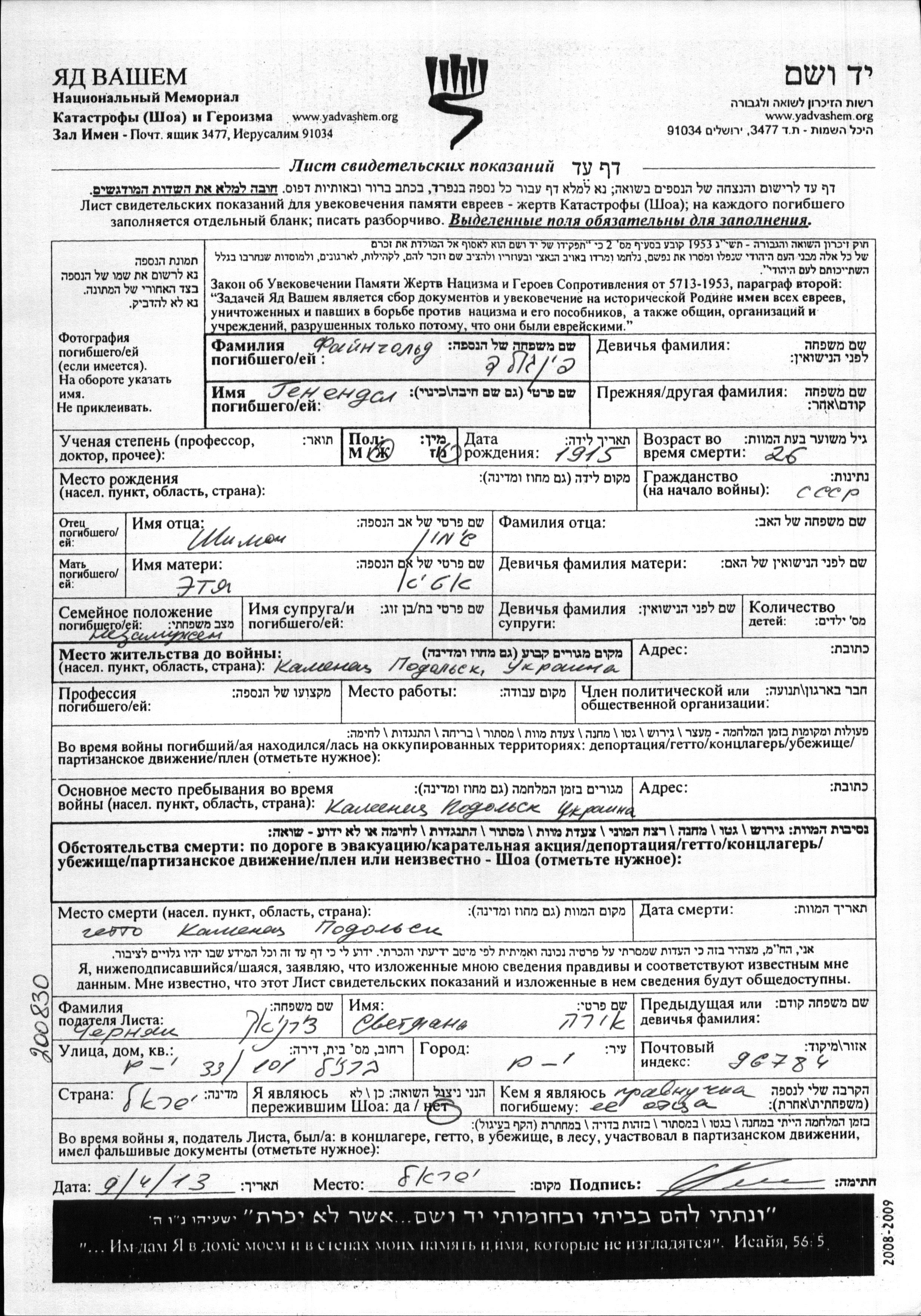 Genendal Fayngold wurde im Jahr 1915 geboren. Sie war die Tochter von Shimon und Etya. Sie war Ledig. Vor dem Zweiten Weltkrieg lebte sie in Kamenets Podolsk, Ukraine (UdSSR). Während des Krieges war sie in Kamenets Podolskiy, Ukraine (UdSSR).