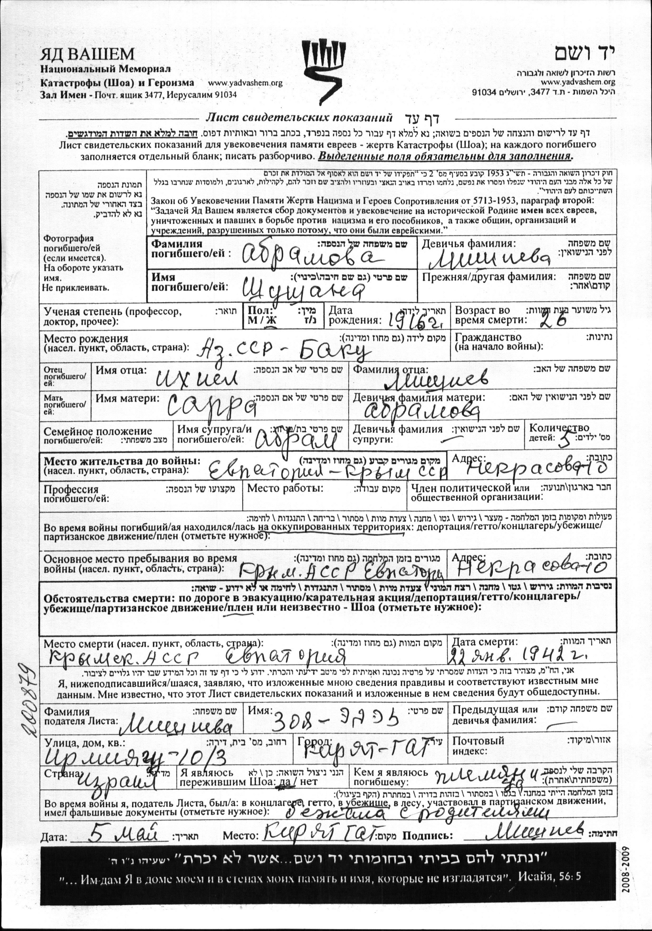 Shushana Abramova, geb. Mishiyeva wurde im Jahr 1916 in Baku, Aserbaidschan (UdSSR) geboren. Sie war die Tochter von Ikhiyel und Sarra. Sie war mit Abram Verheiratet. Vor dem Zweiten Weltkrieg lebte sie in Yevpatoriya, Russland (UdSSR). Während des Krieges war sie in Yevpatoriya, Russland (UdSSR).