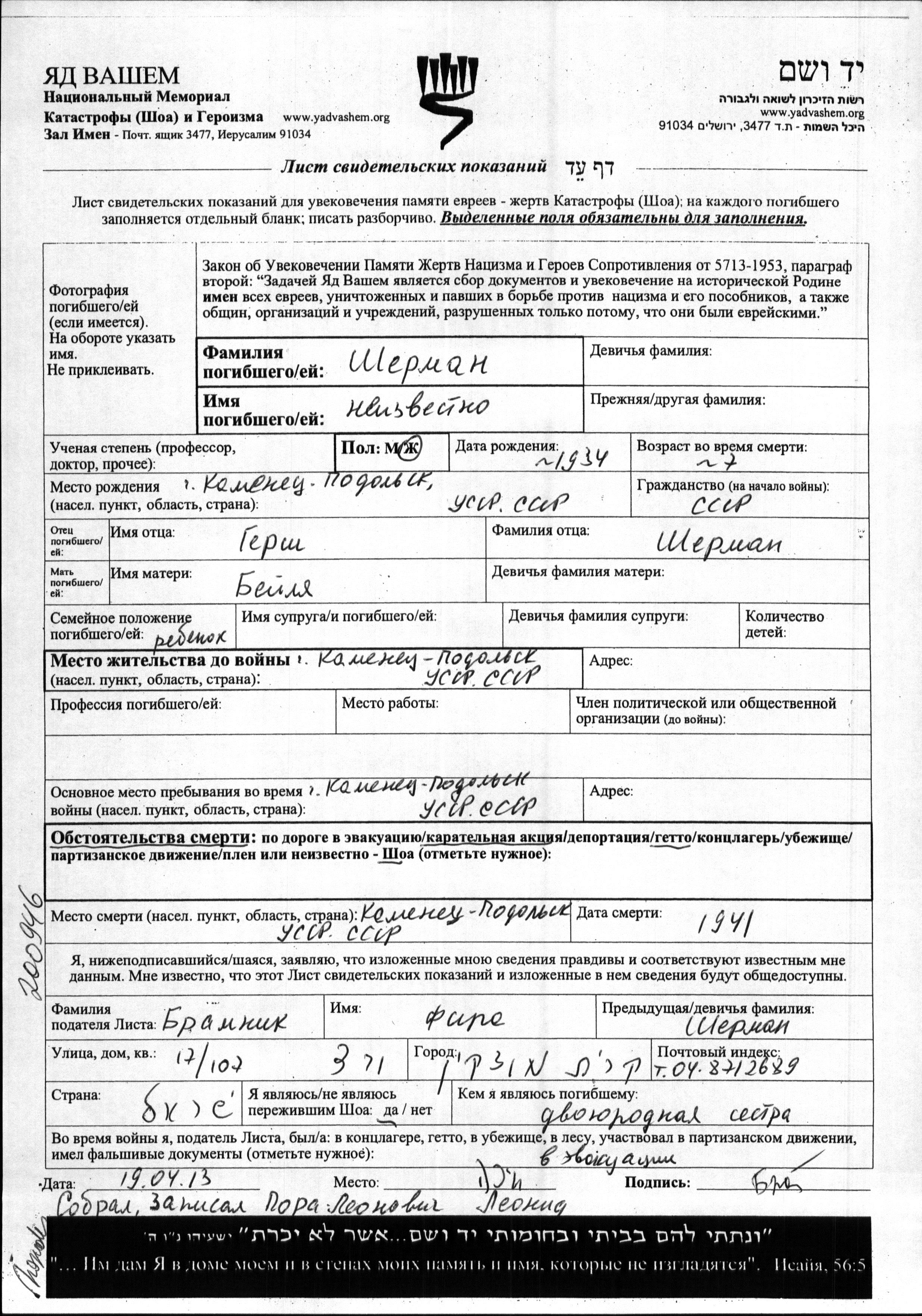 Vorname unbekannt Sherman wurde im Jahr 1934 in Kamenets Podolskiy, Ukraine (UdSSR) geboren. Sie war die Tochter von Gersh und Beylya. Sie war Kind. Vor dem Zweiten Weltkrieg lebte sie in Kamenets Podolskiy, Ukraine (UdSSR). Während des Krieges war sie in Kamenets Podolskiy, Ukraine (UdSSR).