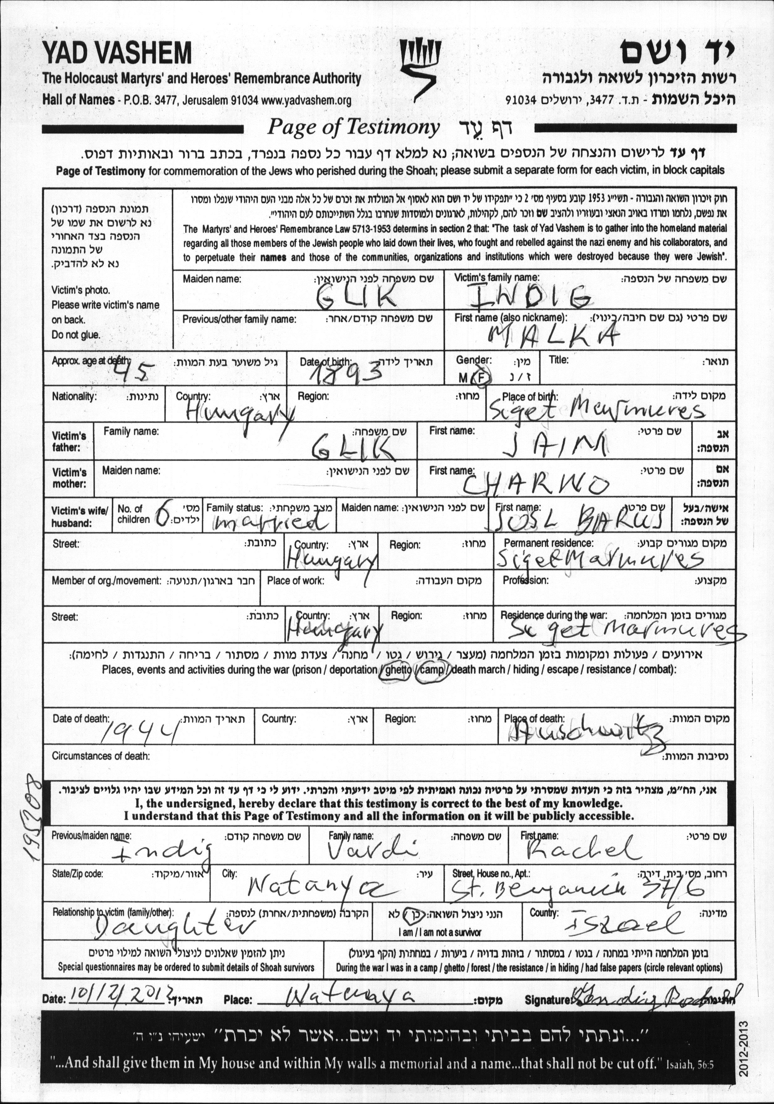 Malka Indig, geb. Glik wurde im Jahr 1893 in Siget, Rumänien geboren. Sie war die Tochter von Jaim und Charno. Sie war mit Josl Baruj Verheiratet. Vor dem Zweiten Weltkrieg lebte sie in Siget, Rumänien. Während des Krieges war sie in Siget, Rumänien.