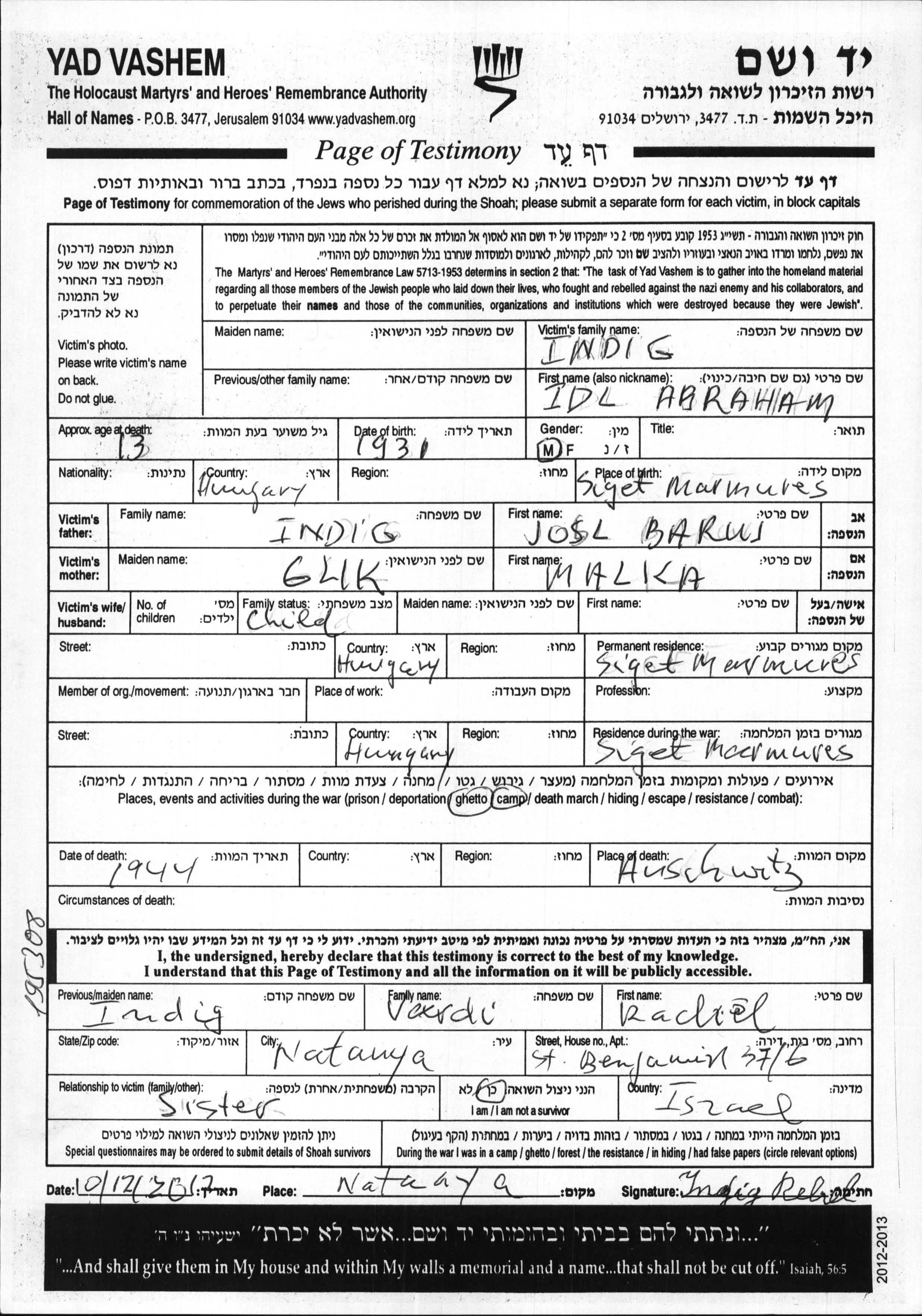 Idl Abraham Indig wurde im Jahr 1931 in Siget, Rumänien geboren. Er war der Sohn von Josl Baruj und Malka, geb. Glik. Er war Jugendliche/-r. Vor dem Zweiten Weltkrieg lebte er in Siget, Rumänien. Während des Krieges war er in Sighet, Rumänien.