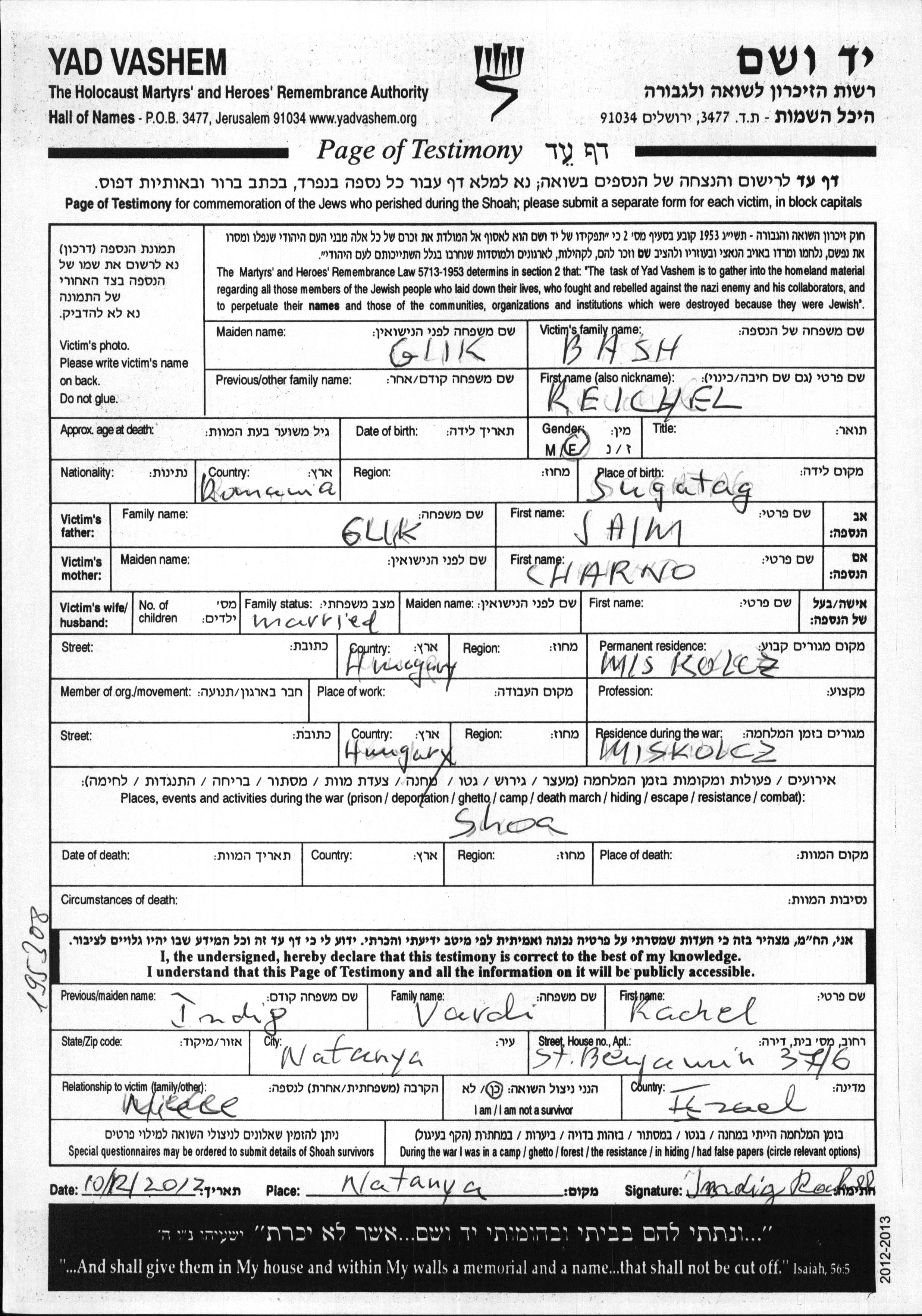Reichel Bash, geb. Glik wurde in Sugatag, Rumänien geboren. Sie war die Tochter von Jaim und Charno. Sie war Verheiratet. Vor dem Zweiten Weltkrieg lebte sie in Miskolc, Ungarn. Während des Krieges war sie in Miskolc, Ungarn.