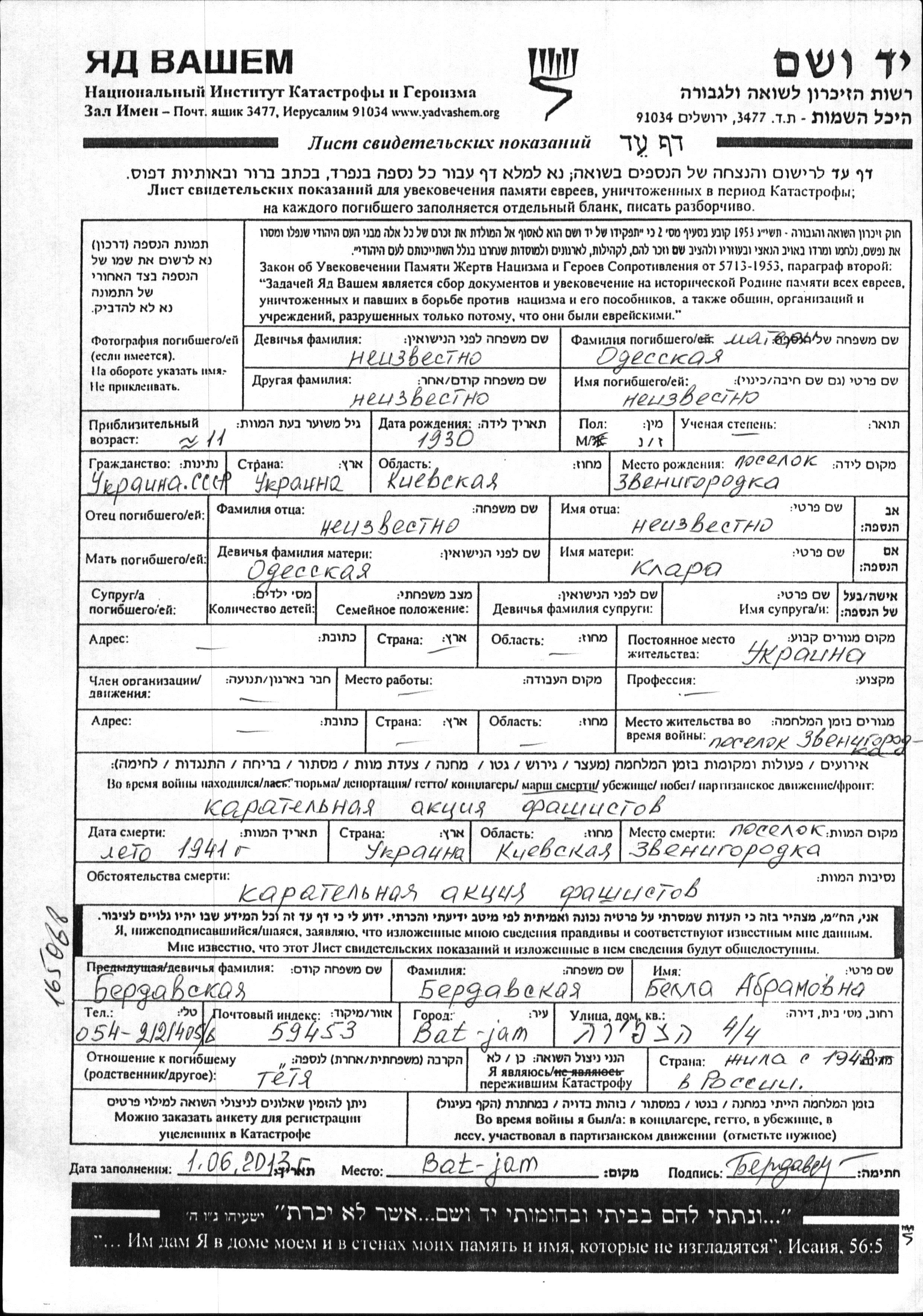 Vorname unbekannt Name unbekannt wurde im Jahr 1930 in Zvenigorodka, Ukraine (UdSSR) geboren. Er war der Sohn von Klara, geb. Odesskaya. Er war Kind. Vor dem Zweiten Weltkrieg lebte er in Ukraine (UdSSR). Während des Krieges war er in Zvenigorodka, Ukraine (UdSSR).