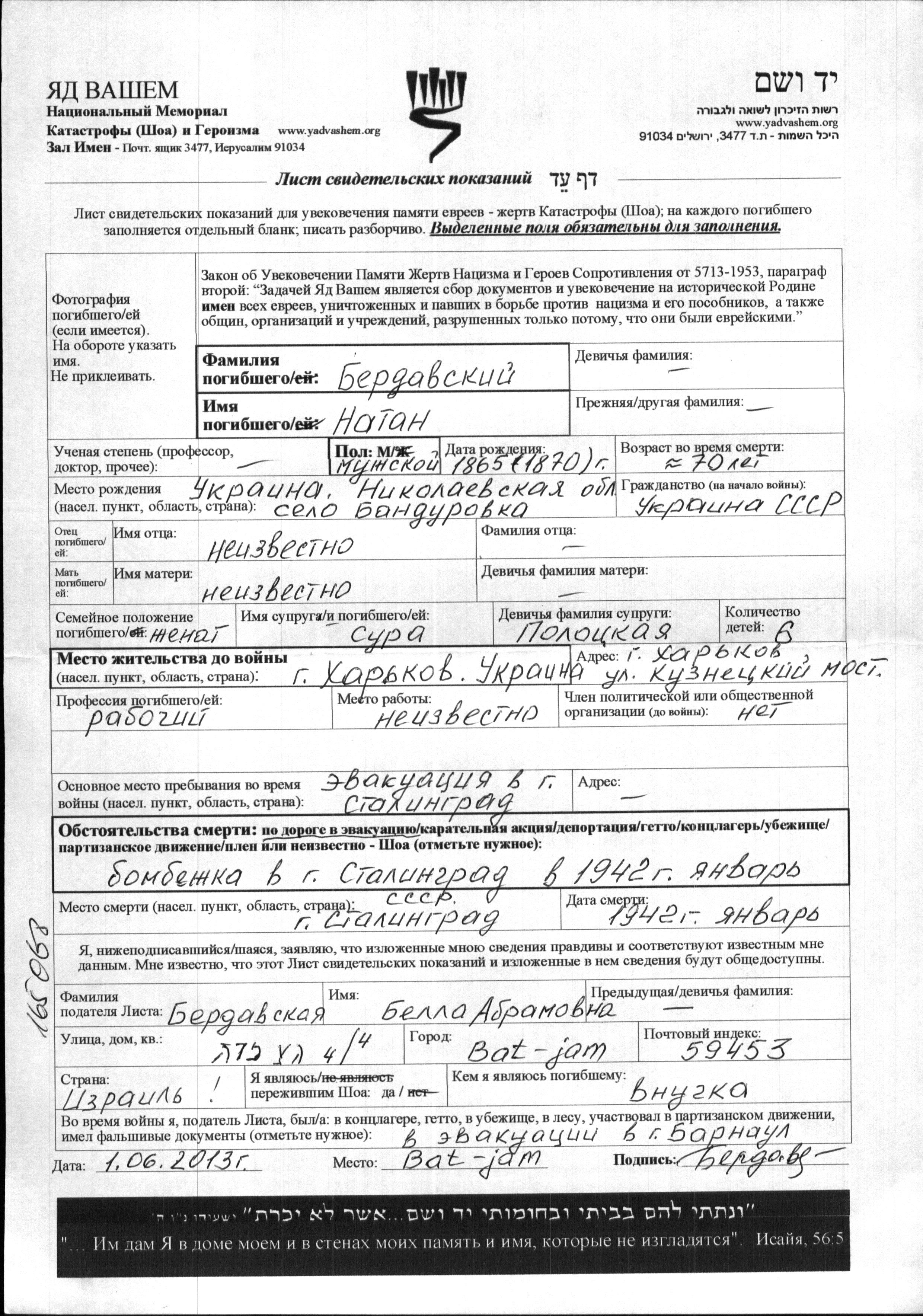 Natan Berdavskiy wurde im Jahr 1870 in Bandurovka, Ukraine (UdSSR) geboren. Er war Arbeiter/-in und mit Sura, geb. Polotzkaya Verheiratet. Vor dem Zweiten Weltkrieg lebte er in Kharkov, Ukraine (UdSSR). Während des Krieges war er in Stalingrad, Russland (UdSSR).