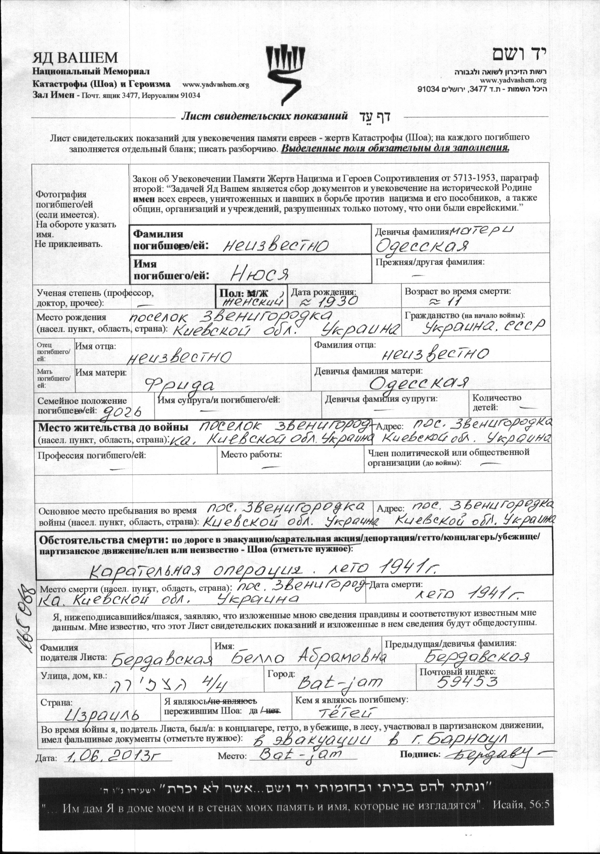 Nyusya Name unbekannt wurde im Jahr 1930 in Zvenigorodka, Ukraine (UdSSR) geboren. Sie war die Tochter von Frida, geb. Odesskaya. Sie war Kind. Vor dem Zweiten Weltkrieg lebte sie in Zvenigorodka, Ukraine (UdSSR). Während des Krieges war sie in Zvenigorodka, Ukraine (UdSSR).