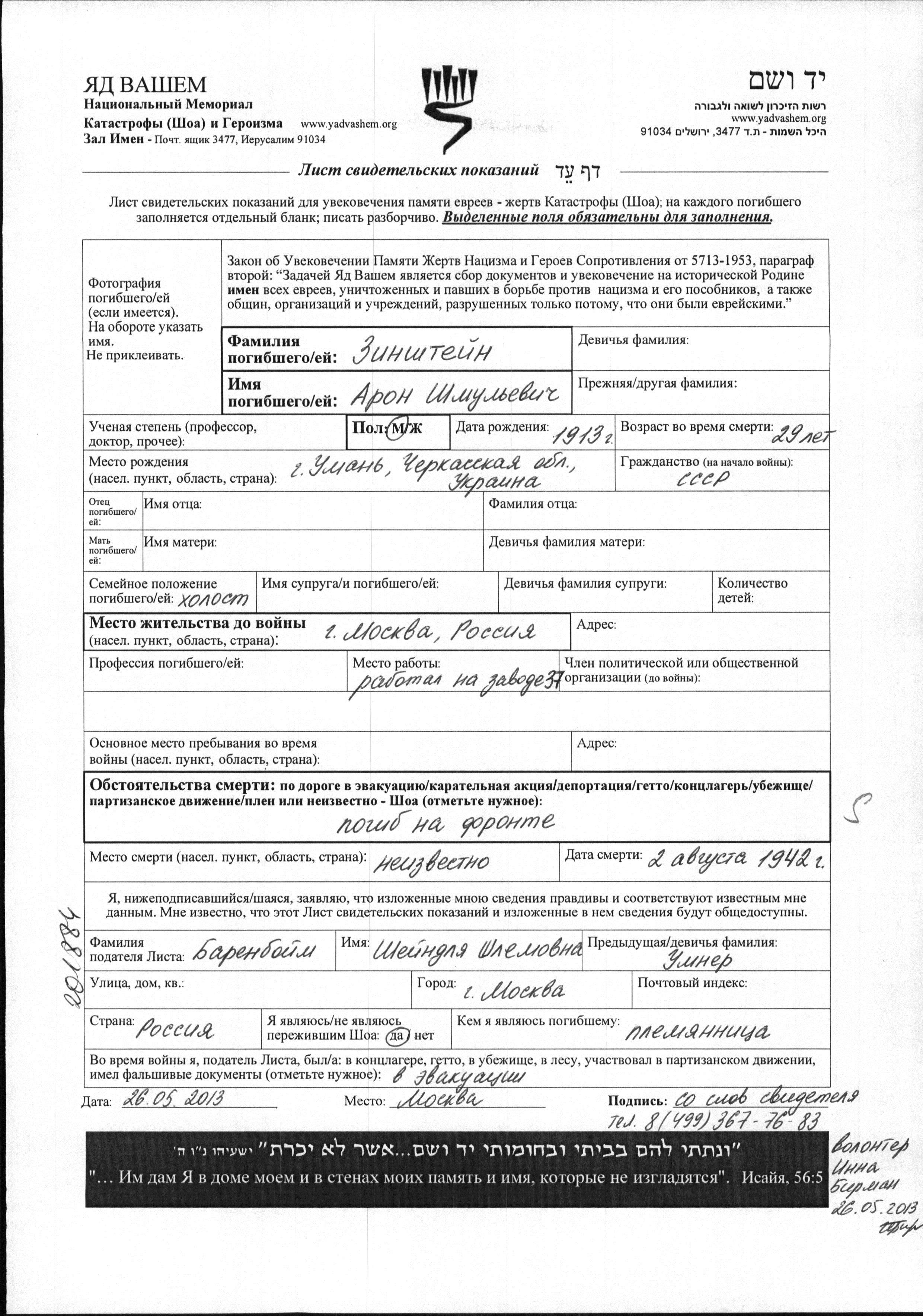 Aron Zinshteyn wurde im Jahr 1913 in Uman, Ukraine (UdSSR) geboren. Er war Ledig. Vor dem Zweiten Weltkrieg lebte er in Moskva, Russland (UdSSR). Während des Krieges war er in die Sowjetischen Streitkräfte.