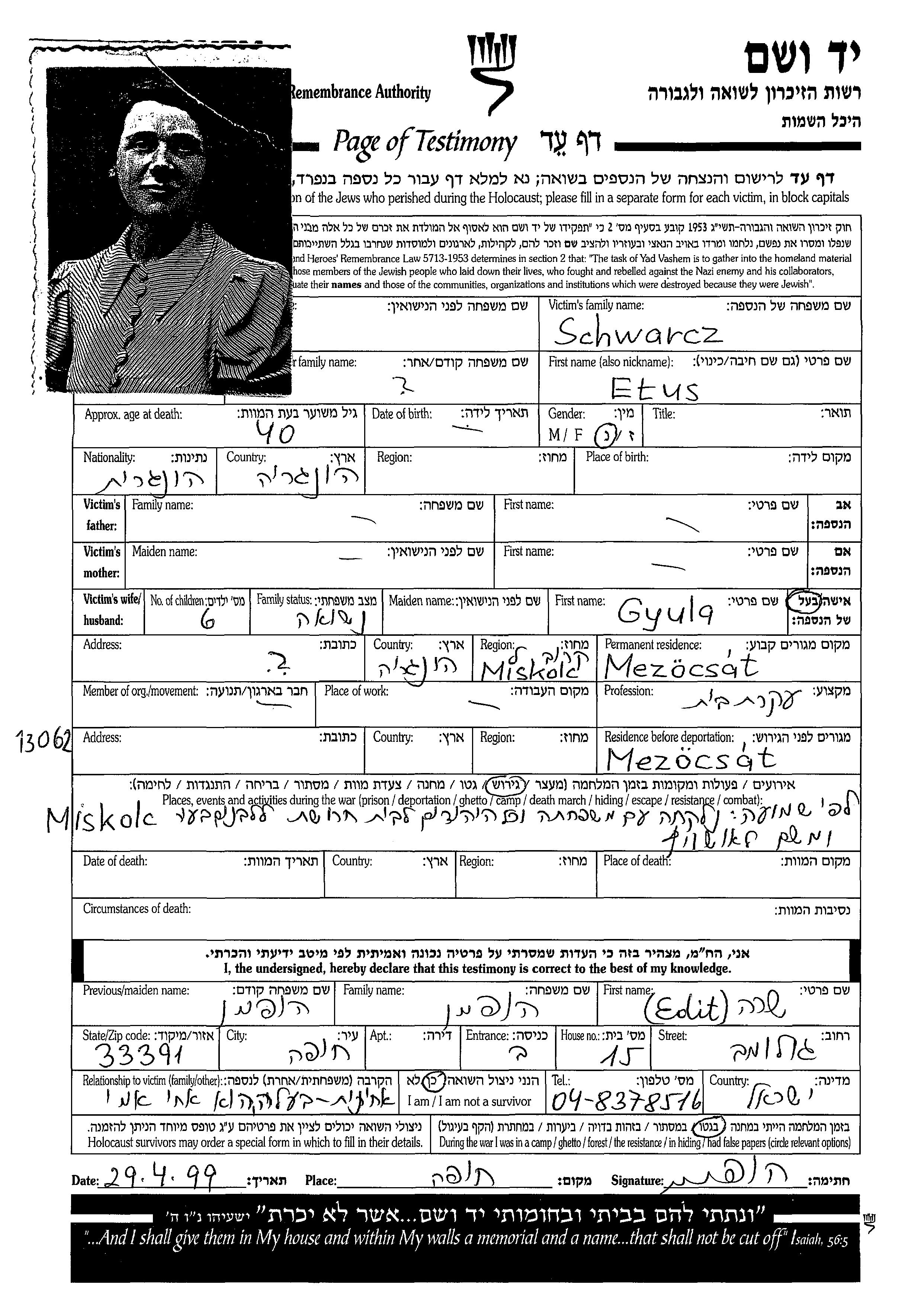 Etus Schwarcz wurde in Ungarn geboren. Sie war Hausfrau und mit Gyula Verheiratet. Vor dem Zweiten Weltkrieg lebte sie in Mezocsat, Ungarn. Während des Krieges war sie in Mezocsat, Ungarn.