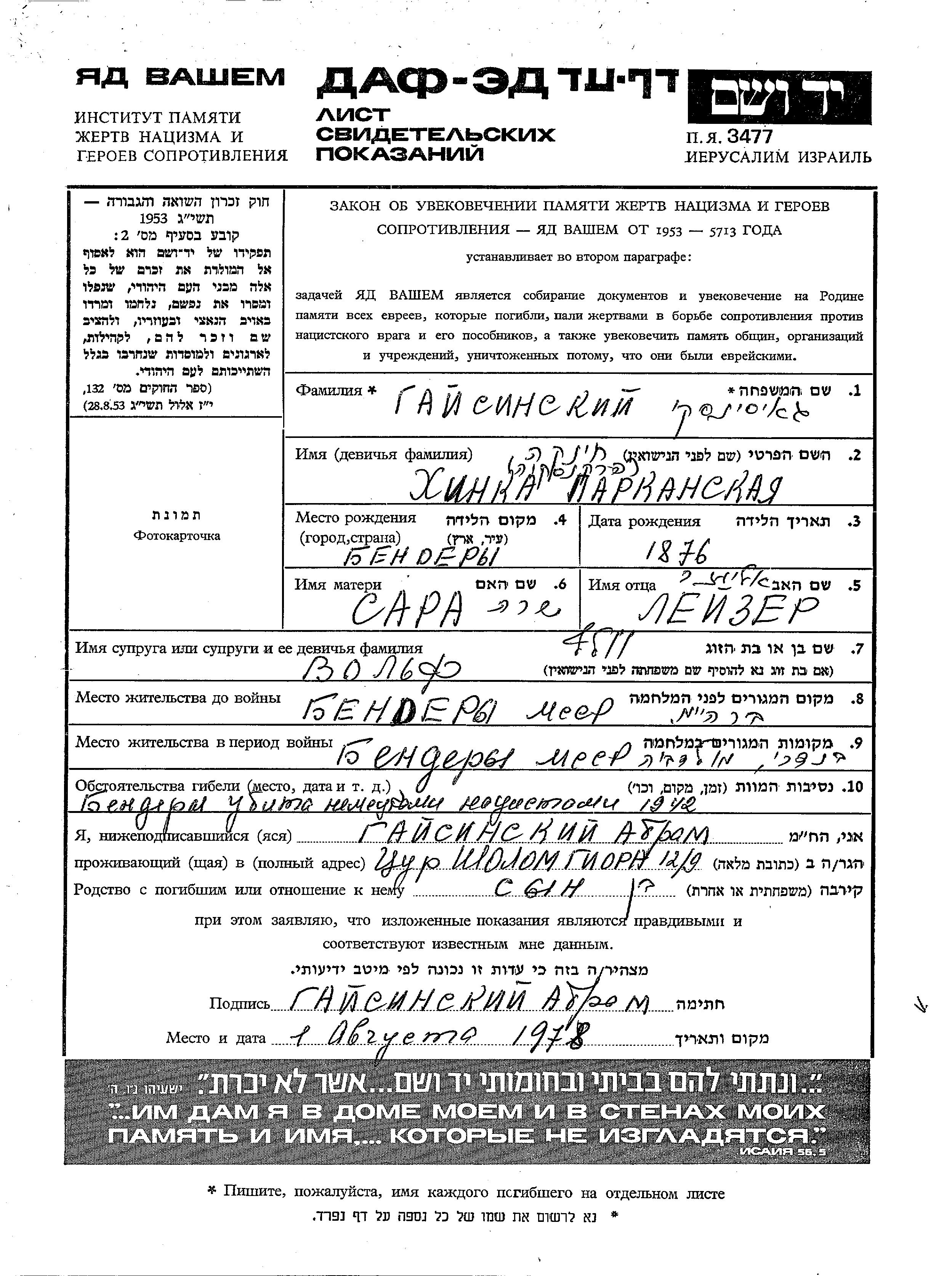 Khinka Gaisinski, geb. Parkanski wurde im Jahr 1876 in Bendery, Rumänien geboren. Sie war die Tochter von Eliezer und Sara. Sie war mit Volf Verheiratet. Vor dem Zweiten Weltkrieg lebte sie in Bendery, Rumänien. Während des Krieges war sie in Bendery, Rumänien.