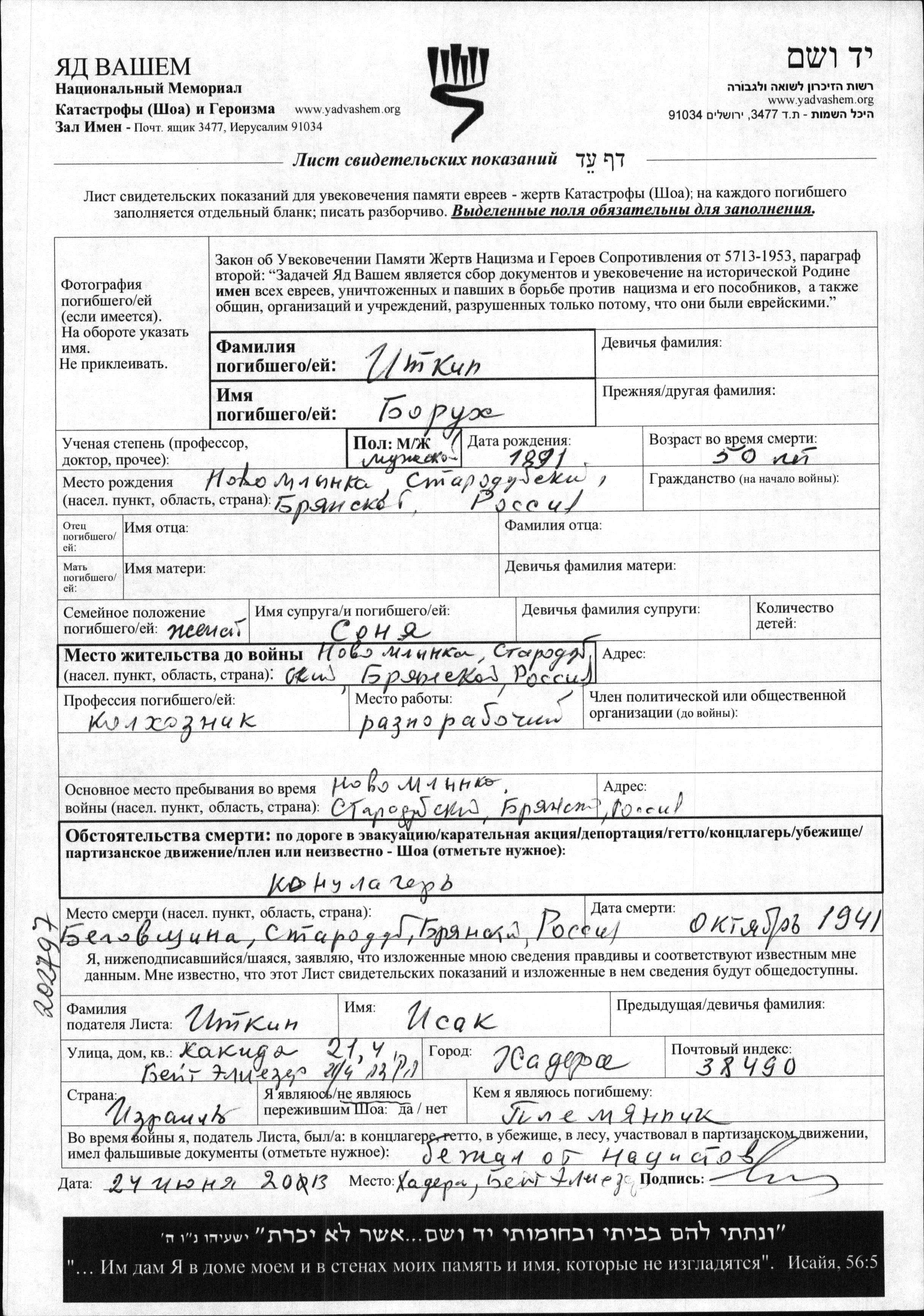 Borukh wurde in der Schoah ermordet. Todesort: Belovshchina, Russland (UdSSR) im Jahr 10/1941.