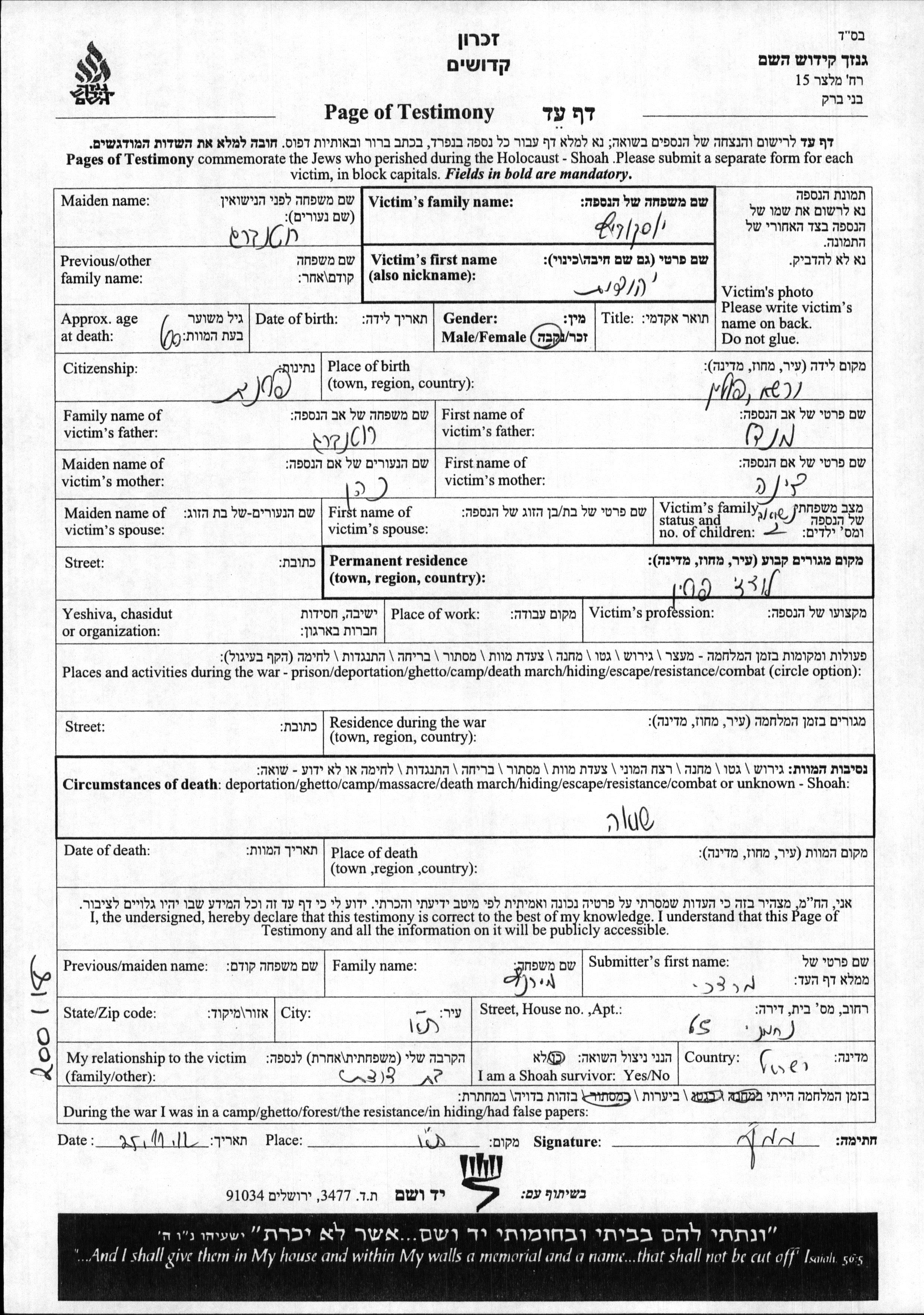Yehudit wurde in der Schoah ermordet.