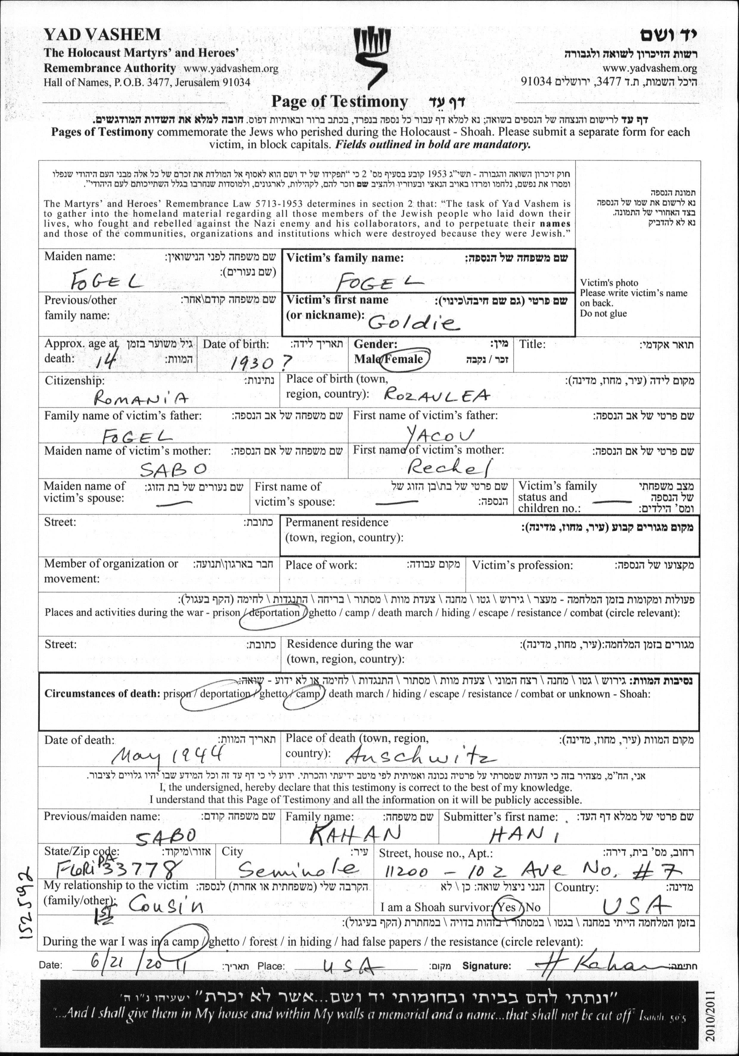 Goldie Fogel wurde im Jahr 1930 in Rozavlea, Rumänien geboren. Sie war die Tochter von Yacov und Rechel, geb. Sabo. Sie war Jugendliche/-r.