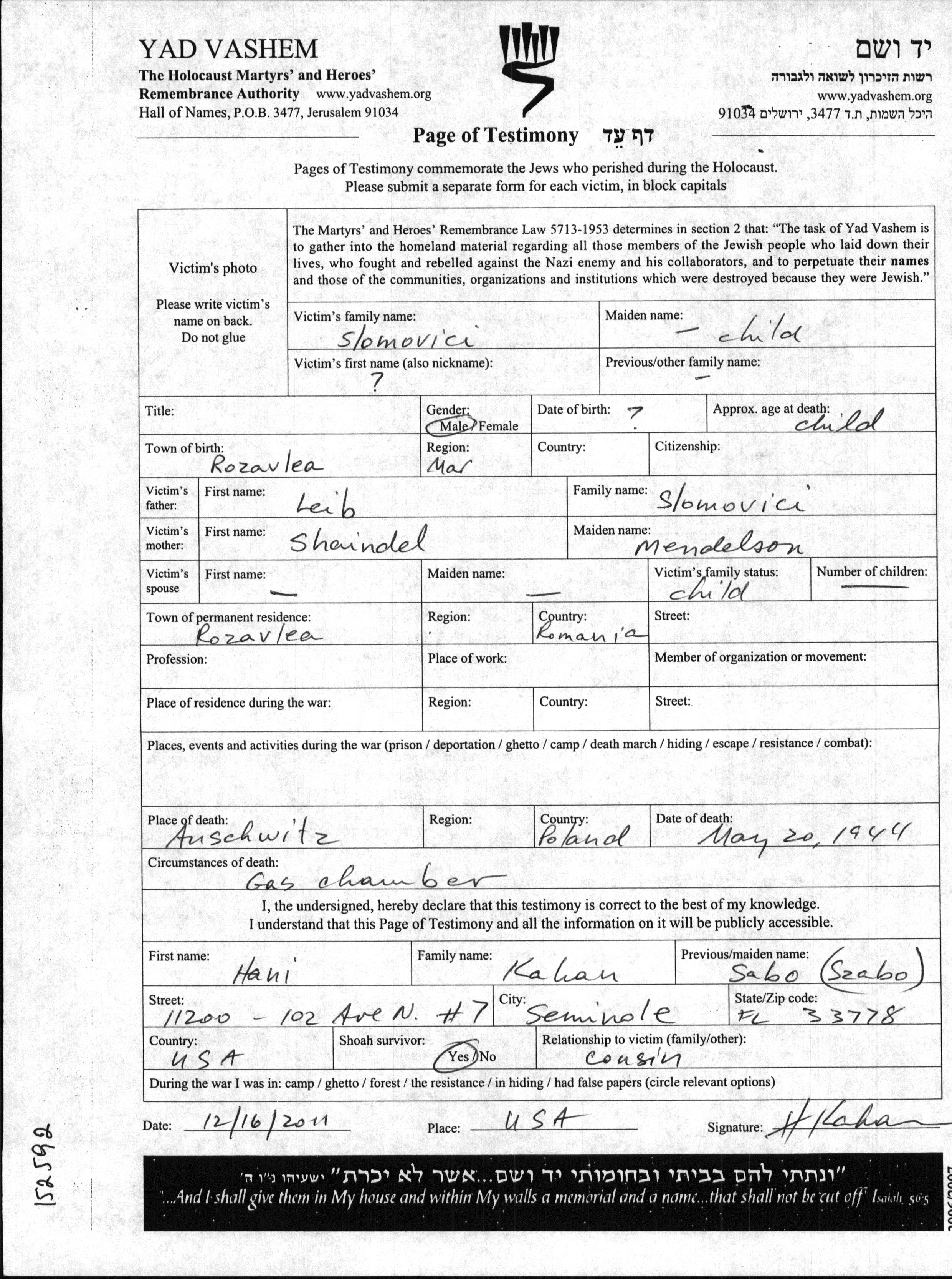 Vorname unbekannt Slomovici wurde in Rozavlea, Rumänien geboren. Er war der Sohn von Leib und Shaindel, geb. Mendelson. Er war Kind. Vor dem Zweiten Weltkrieg lebte er in Rozavlea, Rumänien.