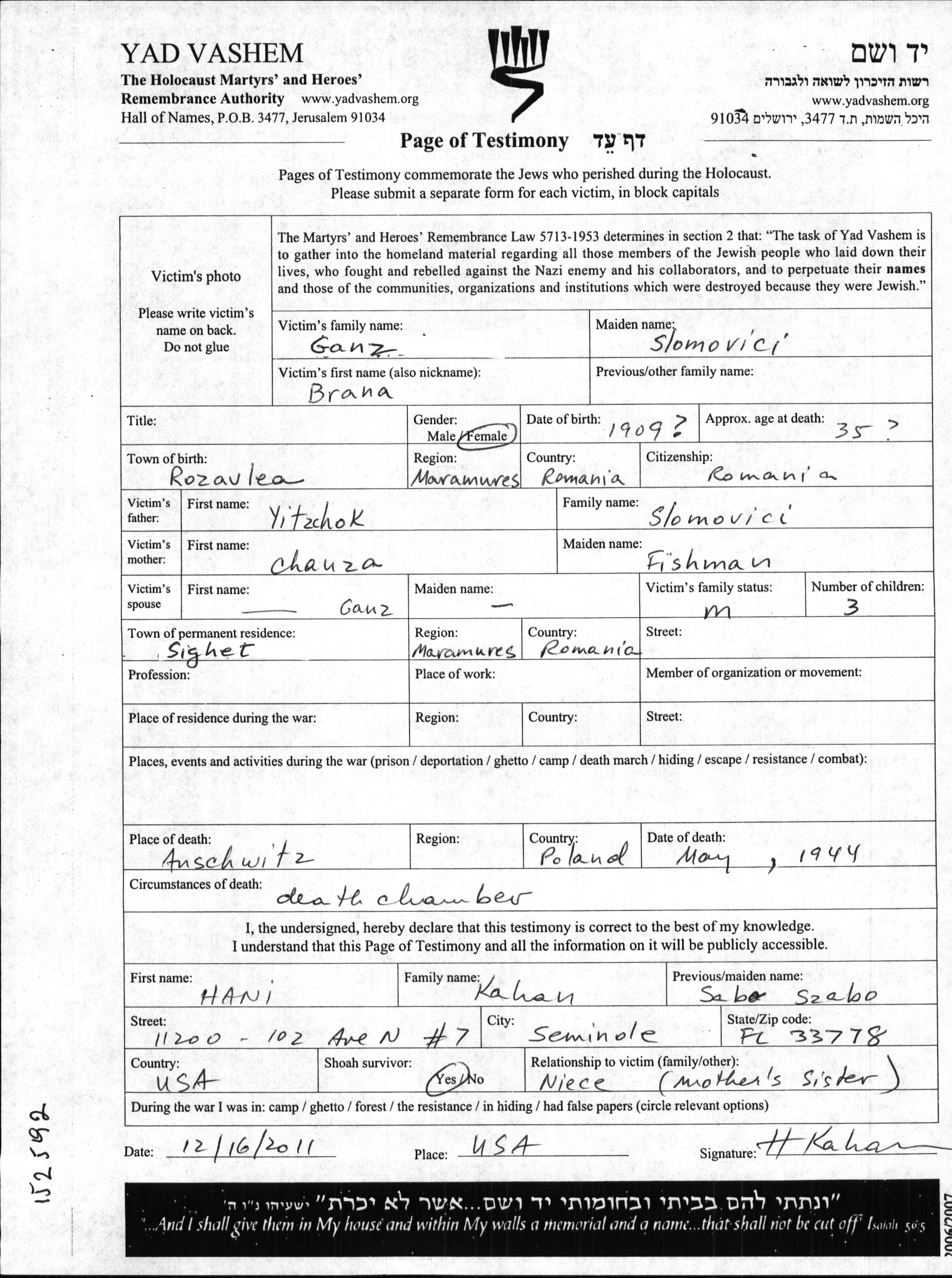 Brana Ganz, geb. Slomovici wurde im Jahr 1909 in Rozavlea, Rumänien geboren. Sie war die Tochter von Yitzchok und Chanza, geb. Fishman. Sie war Verheiratet. Vor dem Zweiten Weltkrieg lebte sie in Sighet, Rumänien.