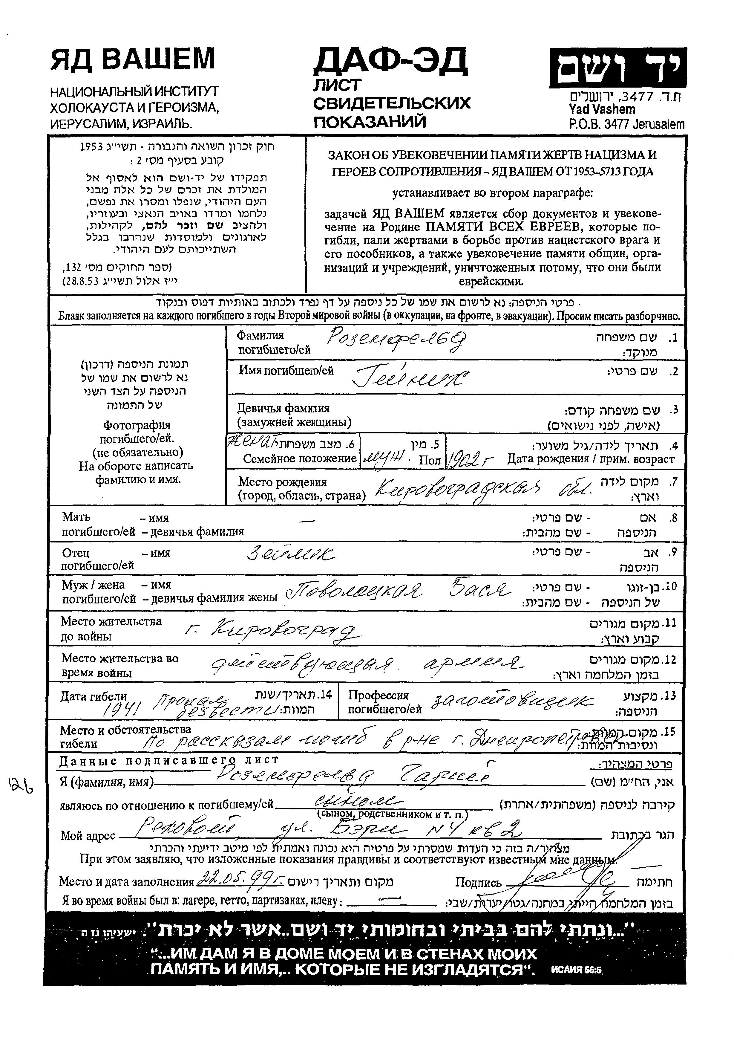 Geinikh Rozenfeld wurde im Jahr 1902 in Kirovograd, Ukraine (UdSSR) geboren. Er war der Sohn von Zeilik. Er war Lieferant und mit Basya Verheiratet. Vor dem Zweiten Weltkrieg lebte er in Kirovograd, Ukraine (UdSSR). Während des Krieges war er in die Sowjetischen Streitkräfte.