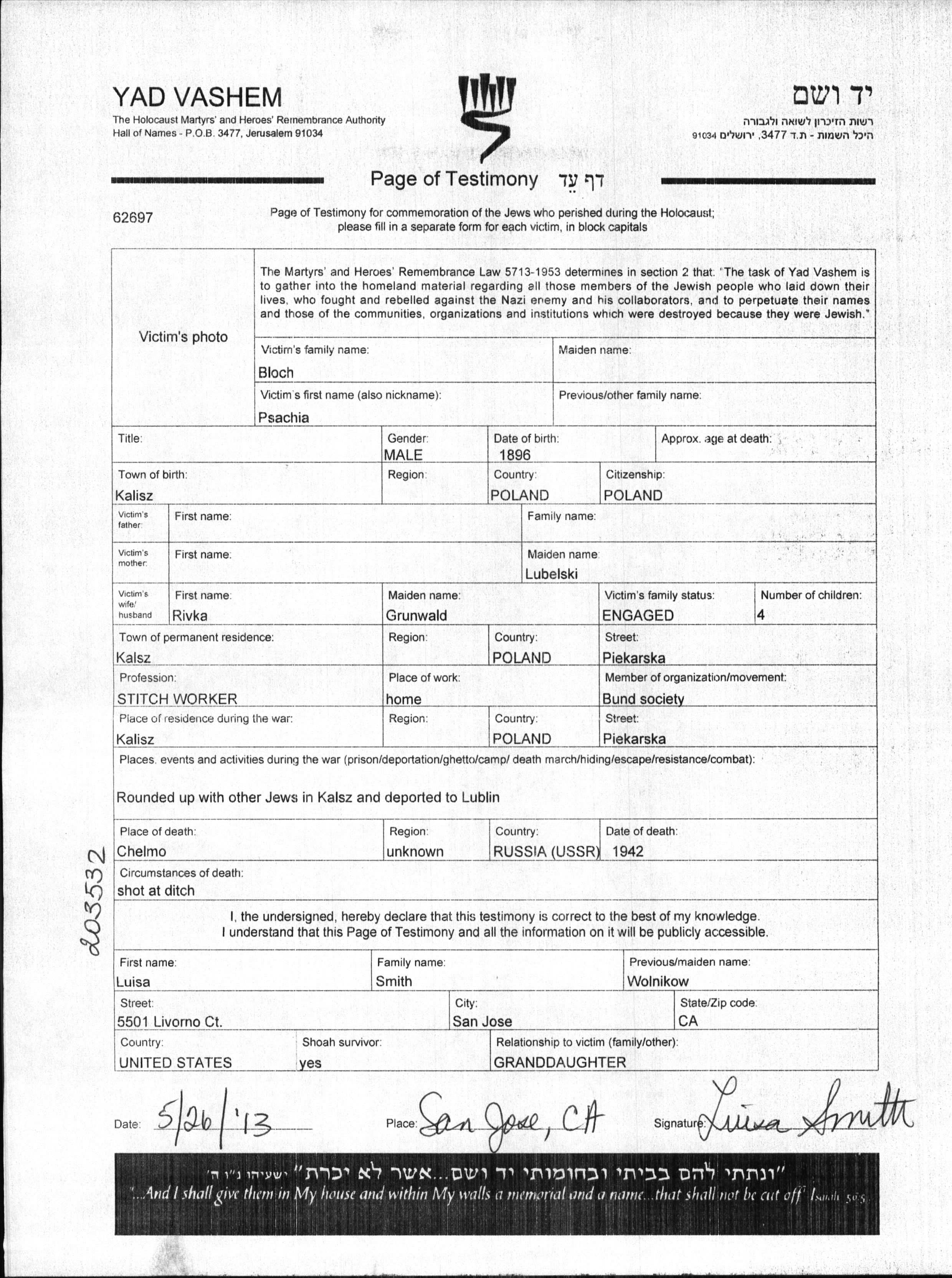 Psachia Bloch wurde im Jahr 1896 in Kalisz, Polen geboren. Er war Näher und mit Rivka, geb. Grunwald Verlobt. Vor dem Zweiten Weltkrieg lebte er in Kalisz, Polen. Während des Krieges war er in Kalisz, Polen.