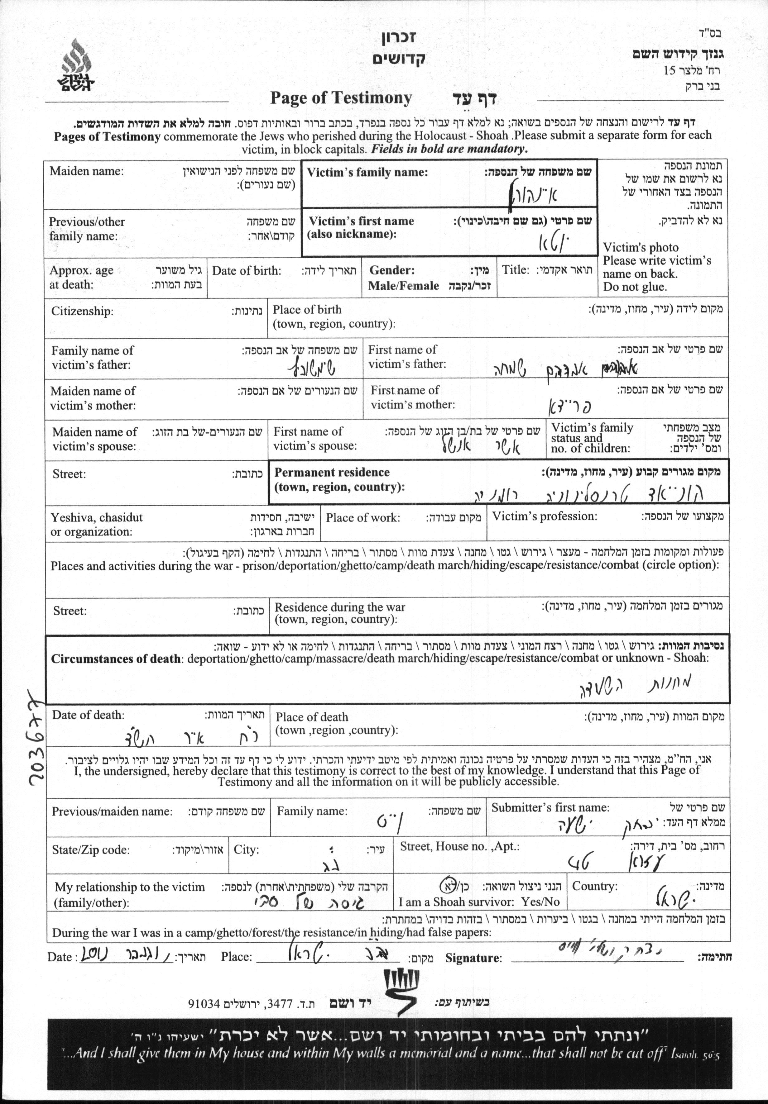 Stadt/Ortschaft oder Lager/Ghetto oder Bezirk/Region oder Land