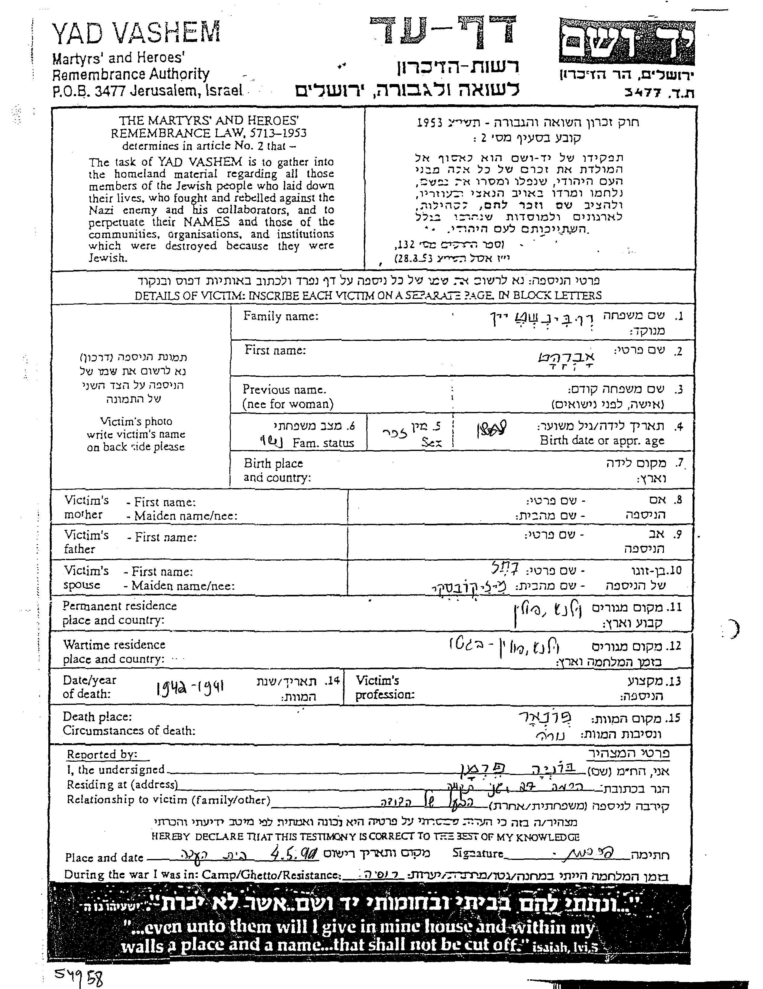 Avraham wurde in der Schoah ermordet. Todesort: Ponary, Polen im Jahr 1941.