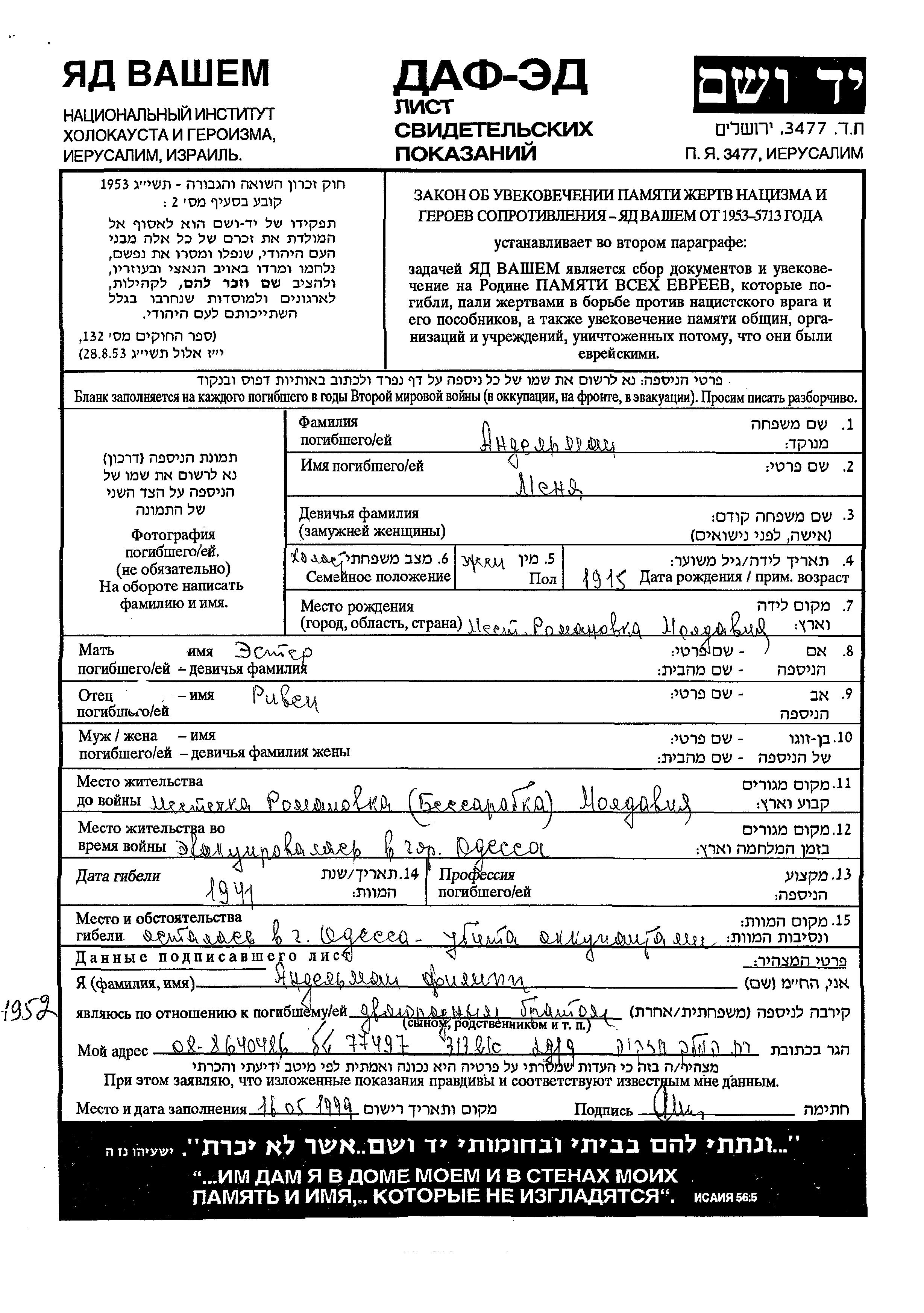 Menya wurde in der Schoah ermordet. Todesort: Odessa, Ukraine (UdSSR) im Jahr 1941.