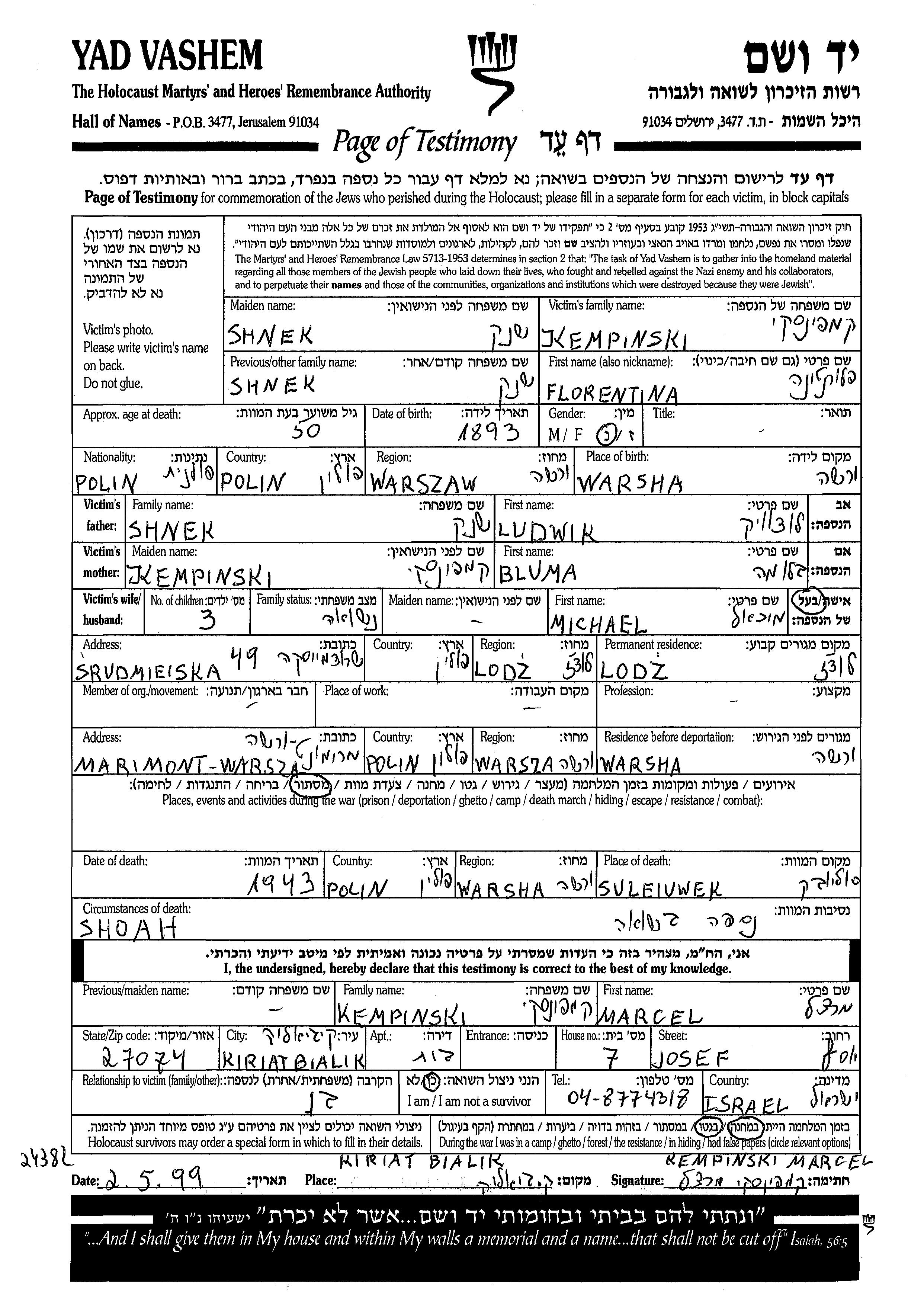 Florentina Kempinski, geb. Shenk wurde im Jahr 1893 in Varsha, Polen geboren. Sie war die Tochter von Ludwik und Bluma. Sie war mit Michael Verheiratet. Vor dem Zweiten Weltkrieg lebte sie in Lodz, Polen. Während des Krieges war sie in Varsha, Polen.