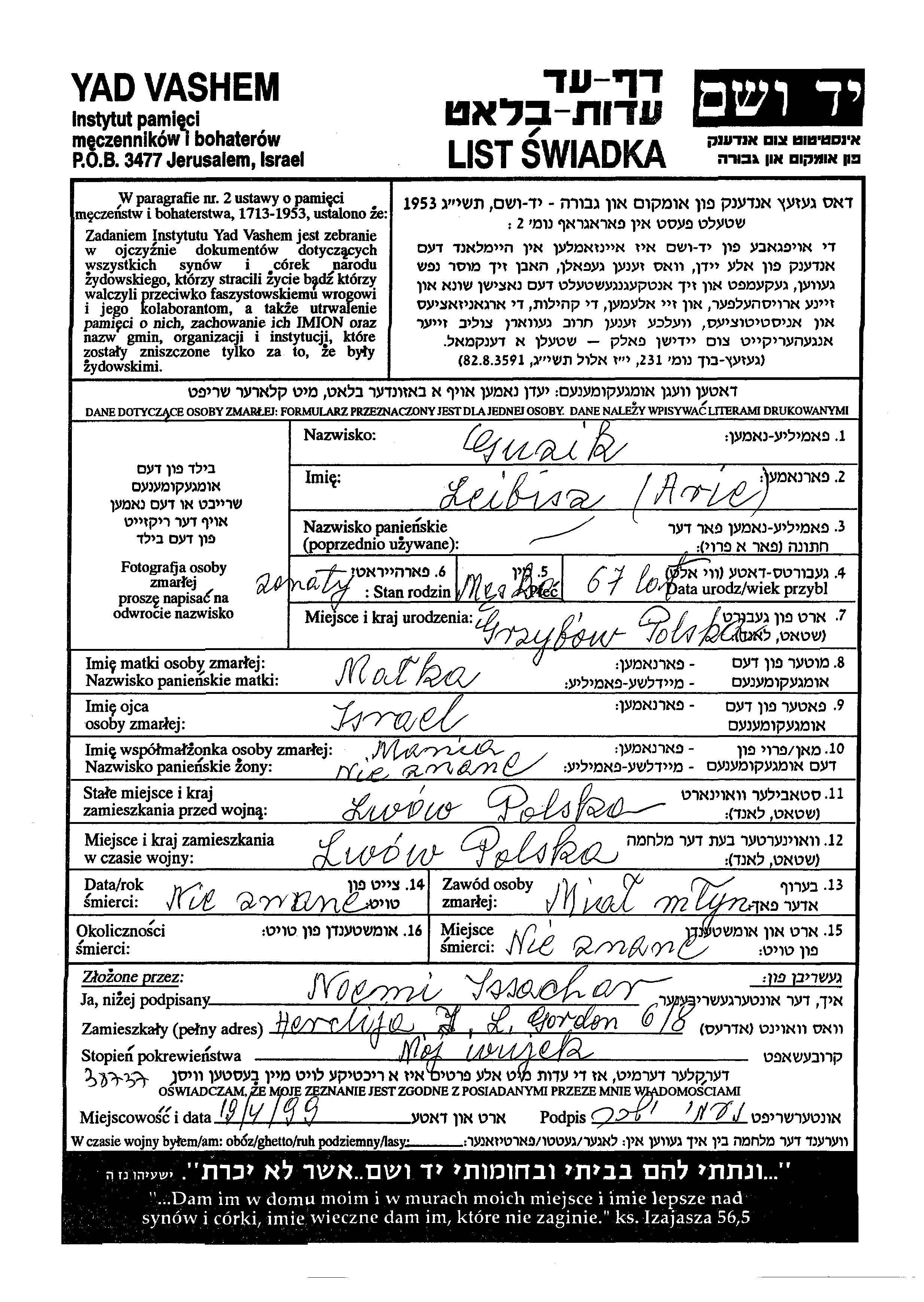 Guzik Leibisz Arie Lwow, Polen Gedenkblatt