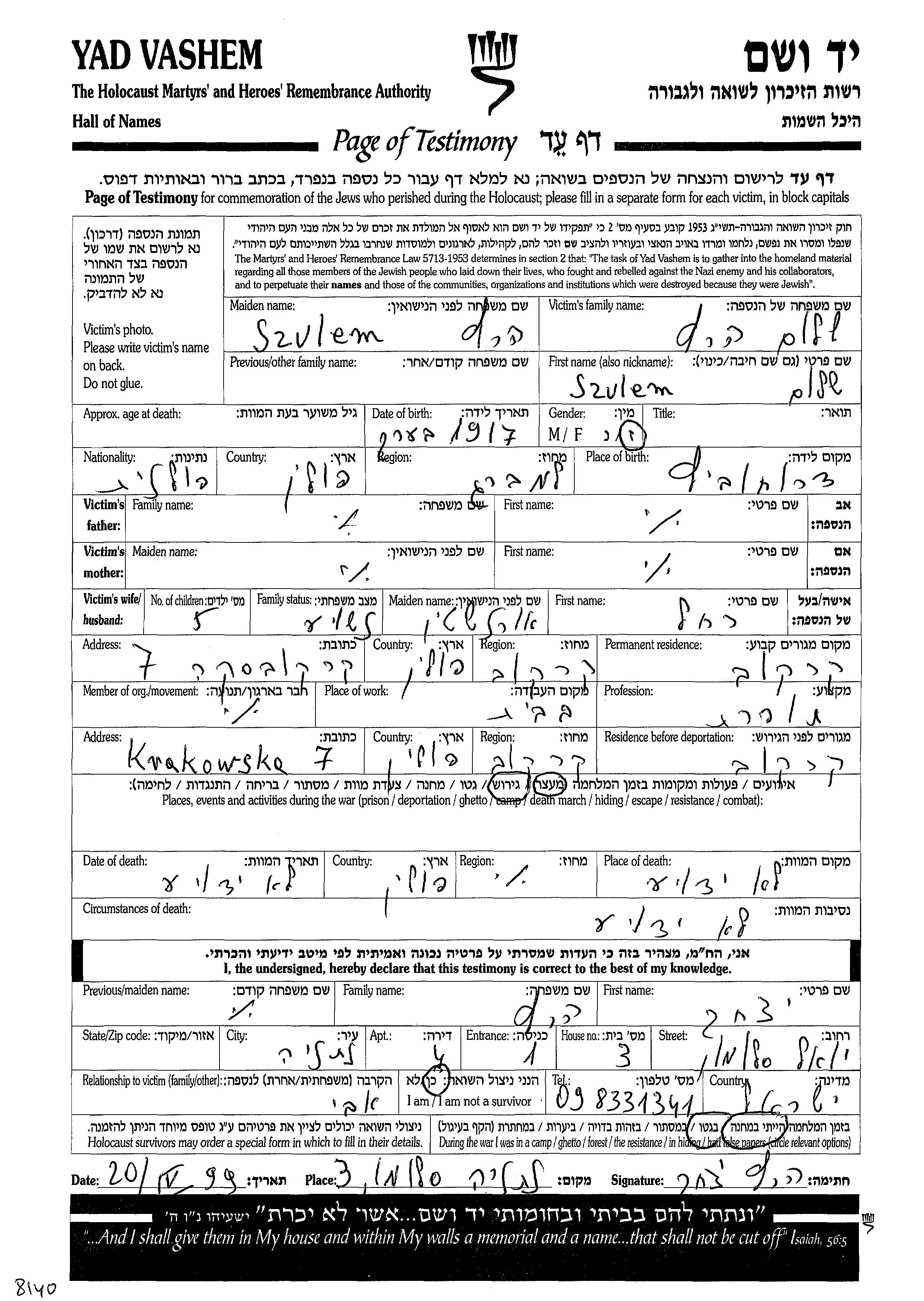 Szulem wurde in der Schoah ermordet. Todesort: Polen.