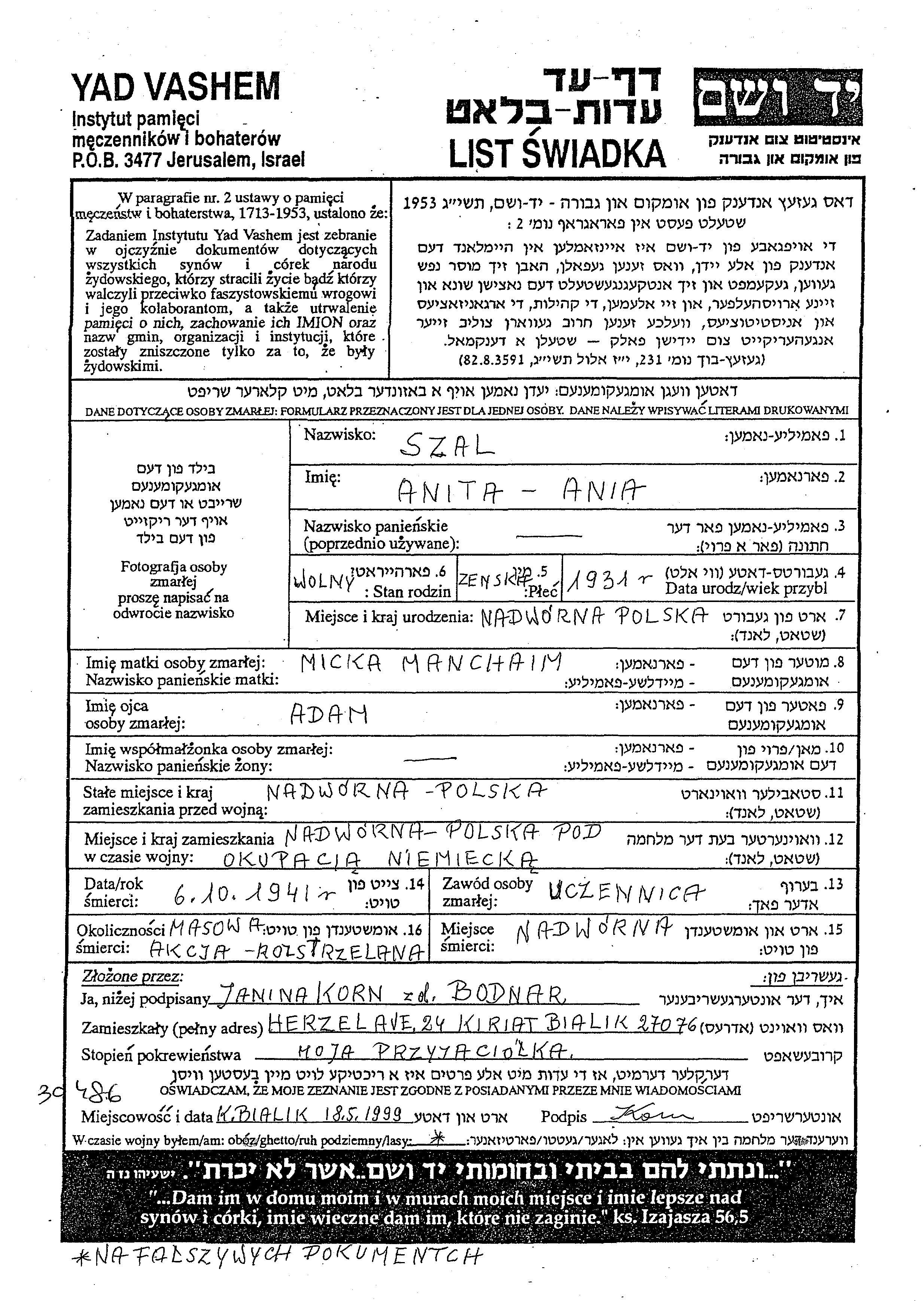 Anita Szal wurde im Jahr 1931 in Nadworna, Polen geboren. Sie war die Tochter von Adam und Micka. Sie war Schüler/-in und Ledig. Vor dem Zweiten Weltkrieg lebte sie in Nadworna, Polen. Während des Krieges war sie in Nadworna, Polen.