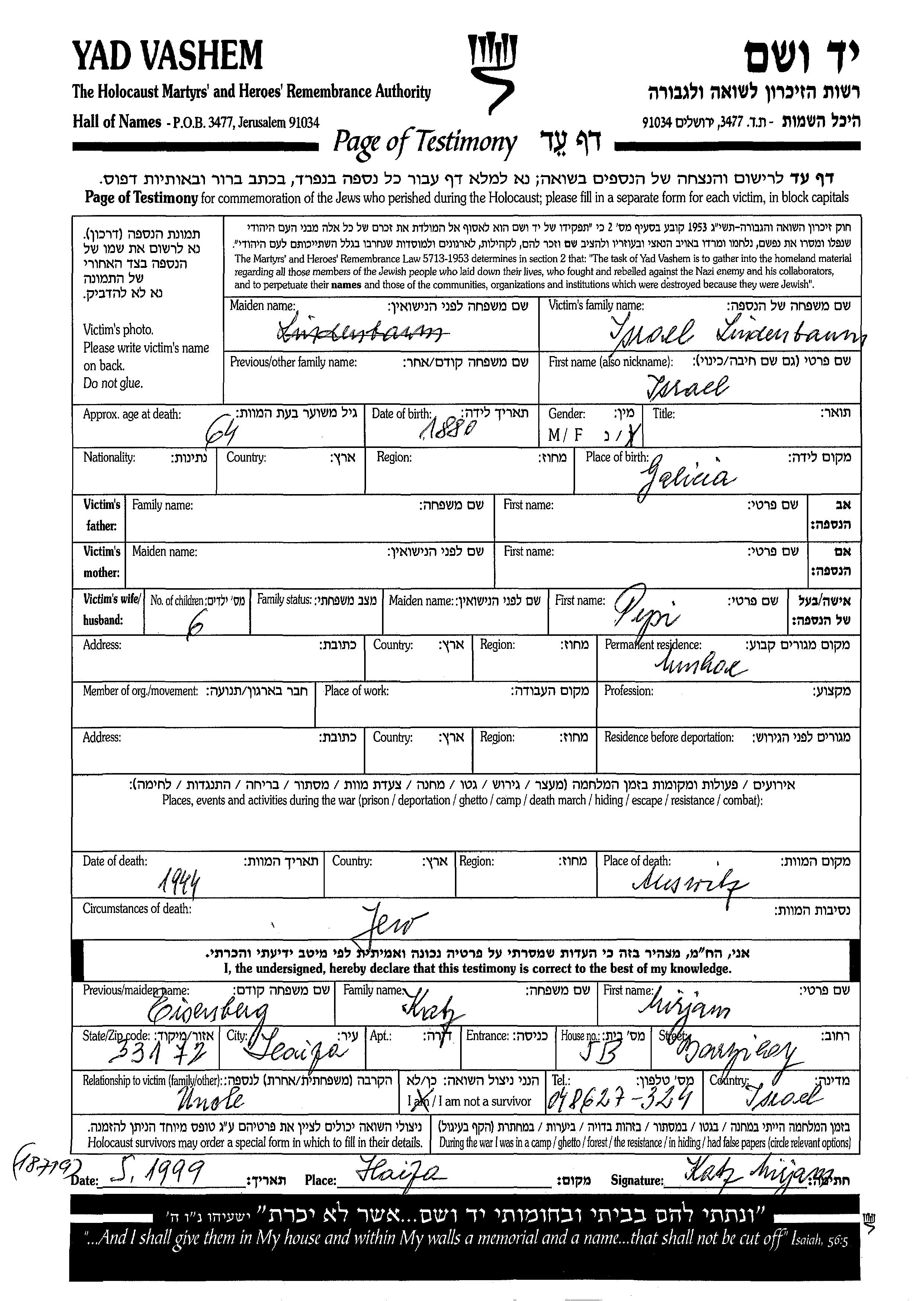 Israel wurde in der Schoah ermordet. Todesort: Auschwitz, Polen im Jahr 1944.